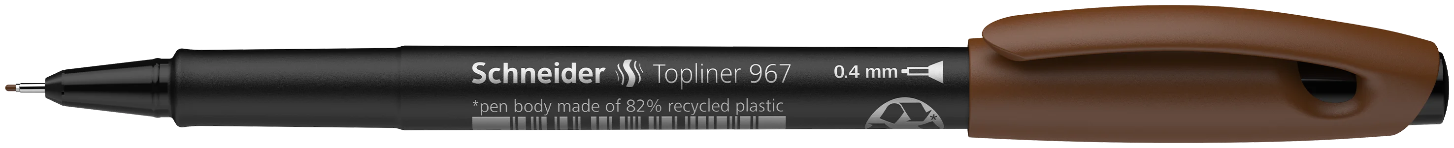 Fineliner mit metallgefasster Schreibspitze für feine und exakte Schrift ca. 0,4 mm. Schreibfarbe braun. Umwelt- und ressourcenschonend mit einem *Gehäuse aus 82 % recyceltem Kunststoff hergestellt. Vielfältig nutzbar für Schule, Hobby, Beruf - auch für die Arbeit mit Lineal und Schablone geeignet. Die Cap-Off-Tinte trocknet nicht ein, auch wenn der Stift 2-3 Tage offen bleibt. Das Gehäuse aus verdunstungsfestem PP ermöglicht eine besonders lange Lagerfähigkeit.