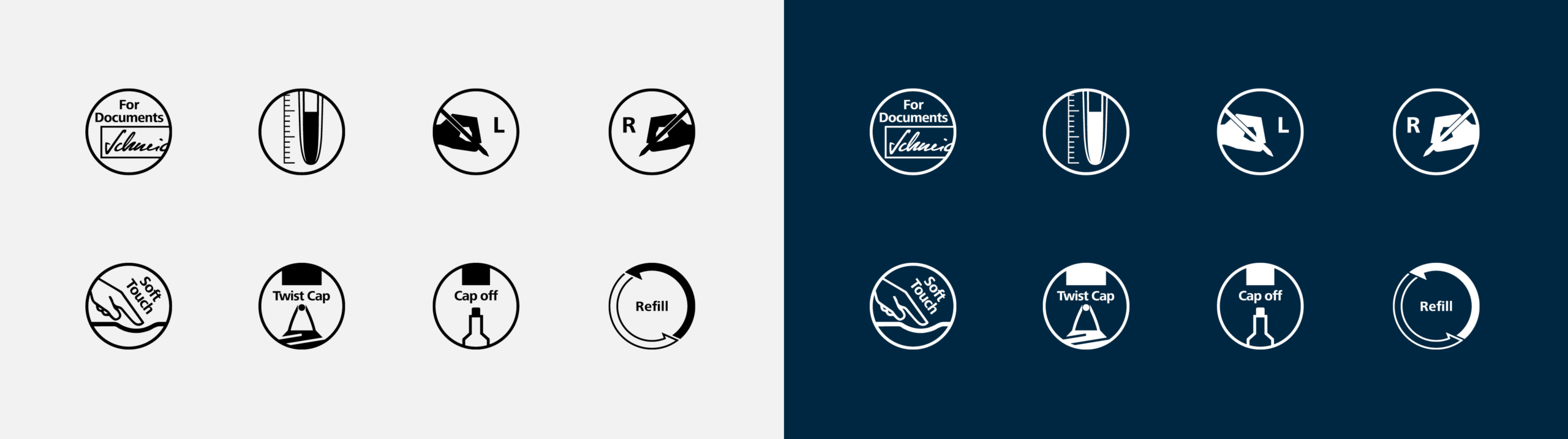 Um technische Produkteigenschaften wie zum Beispiel Nachfüllbarkeit, Dokumentenechtheit oder Linkshänder-Orientierung übersichtlich darzustellen, wird die Icon-Kategorie Features verwendet. Sie liegt in den beiden Farbversionen Schwarz und Weiß vor. Welche Icons für ein bestimmtes Schreibgerät eingesetzt werden, ist im Kundenportal beim jeweiligen Produkt hinterlegt.
