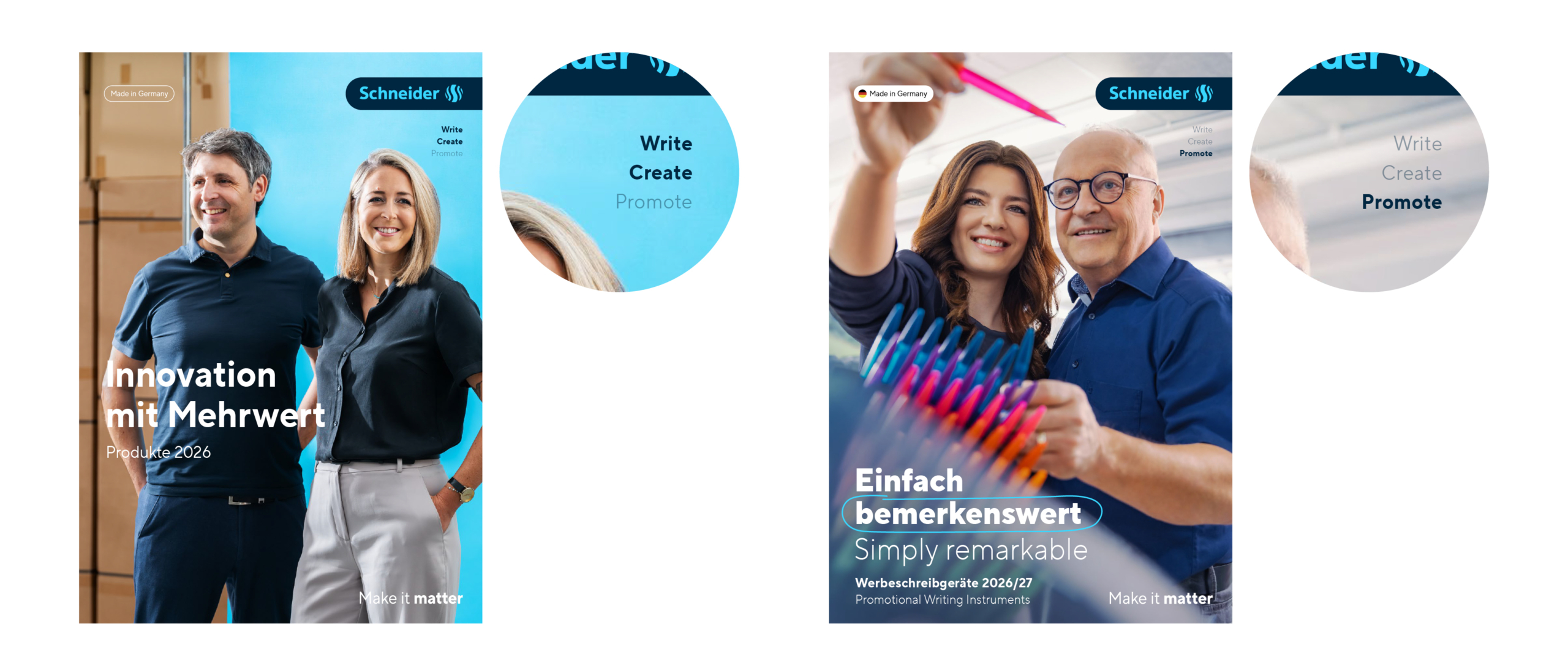 The three product areas ‘Write’, ‘Create’ and ‘Promote’ are arranged vertically with right alignment. The areas of the product range that are the focus of communication are in bold. The other areas recede visually into the background thanks to the regular cut and transparency.