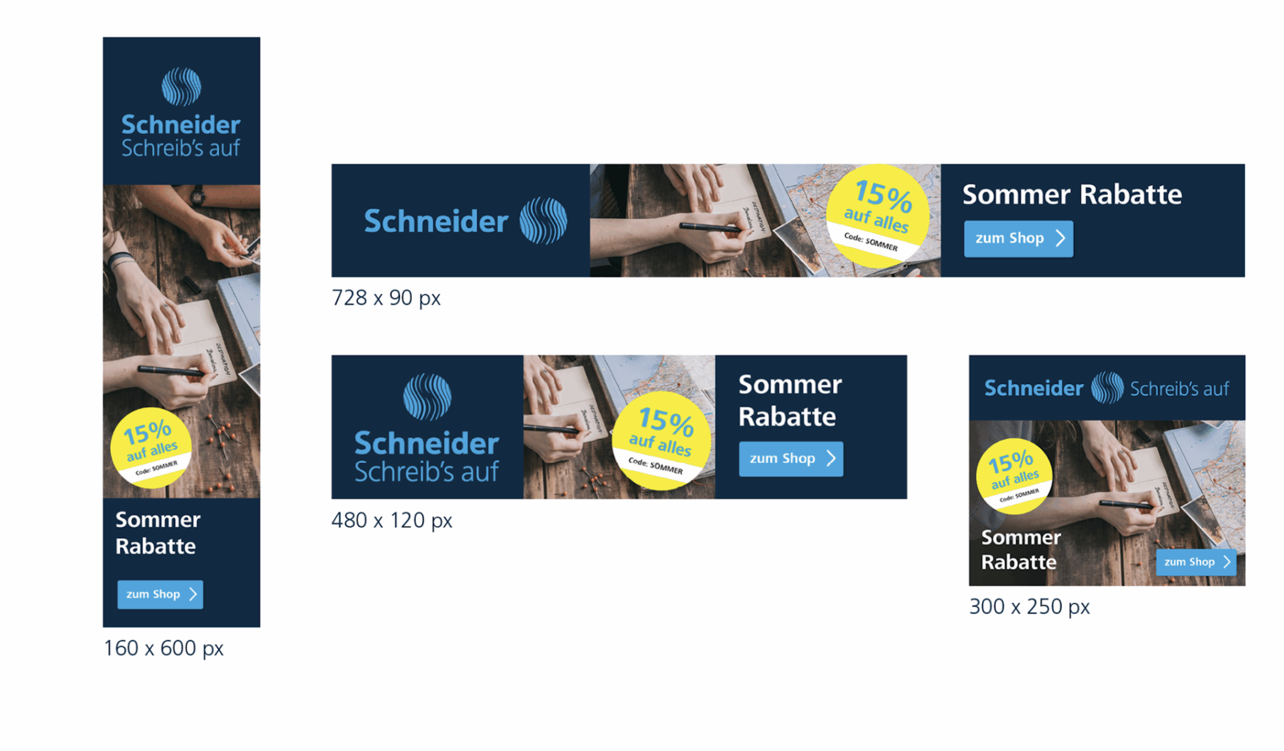 Onlinebanner können in den unterschiedlichsten Formaten gestaltet werden: vom sehr schmalen Hochformat bis zum außergewöhnlich breiten Querformat. Die äußere Form kann variieren, die Gestaltungsmittel bleiben jedoch immer konstant.