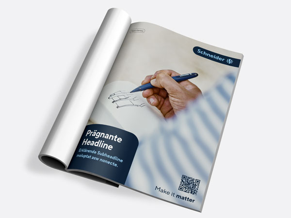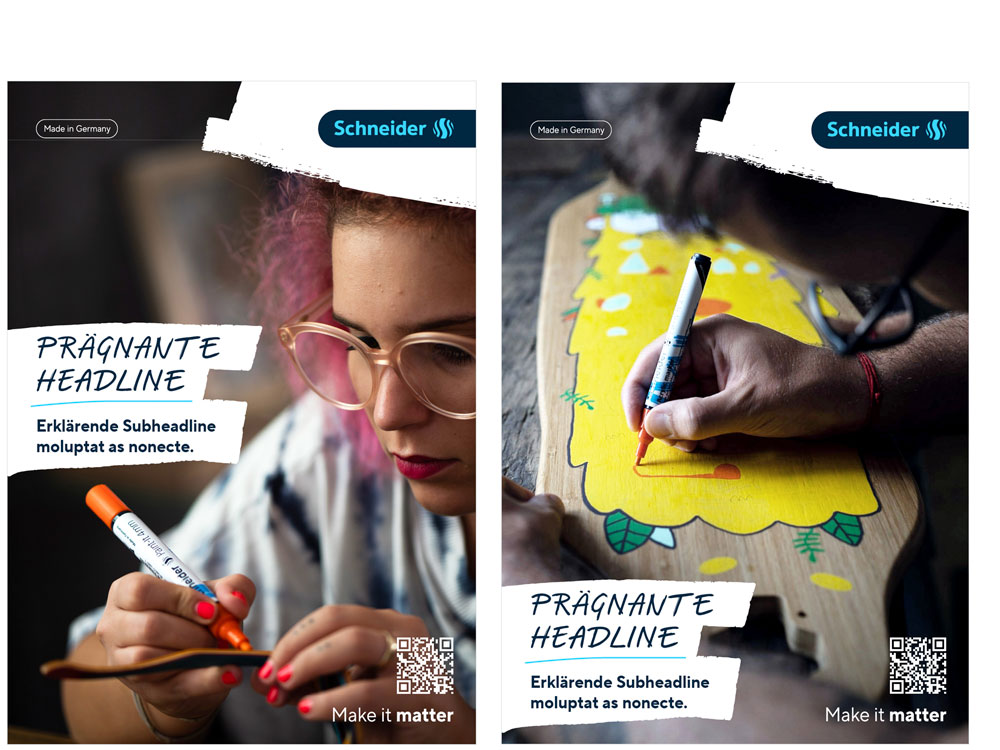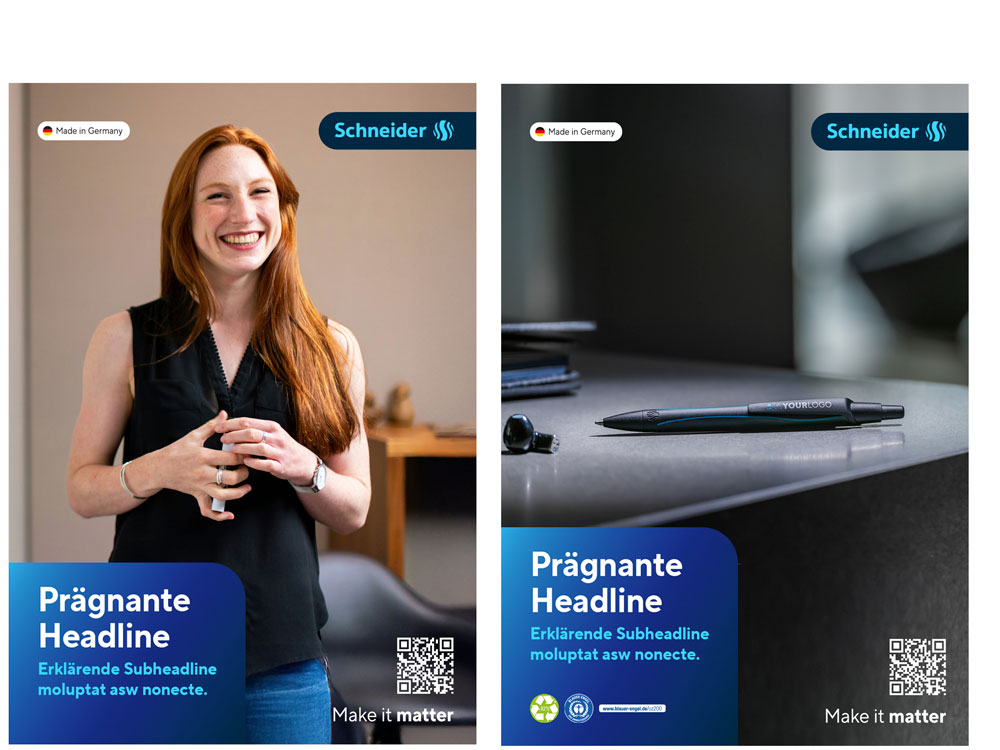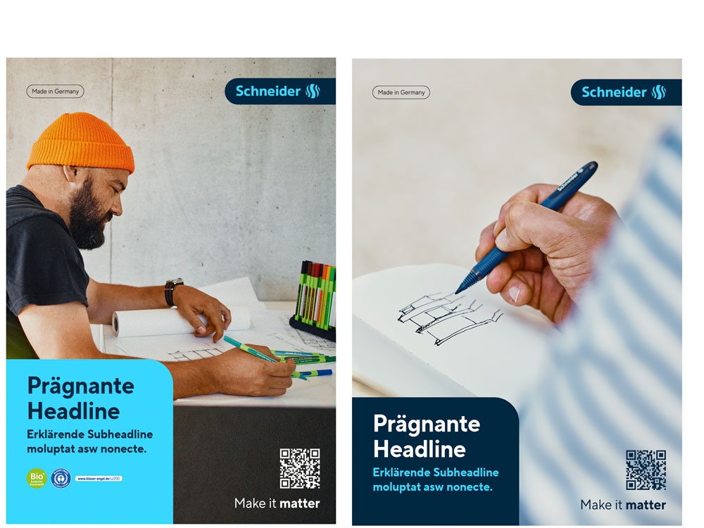 Für ein tiefergehendes Storytelling ist die Zwei-Bild-Anzeige die richtige Wahl. Zwei Motive geben Gelegenheit, eine visuelle Geschichte zu erzählen und Mensch wie Produkt gleichwertig zu inszenieren. Beim Produktbereich Write darf die Farbfläche in Heritage Blue oder Matter Blue eingefärbt werden. Für alle drei Produktbereiche stehen Vorlagen mit dem Namen „2-image“ zum Download bereit, die bereits CI-konform angelegt sind.