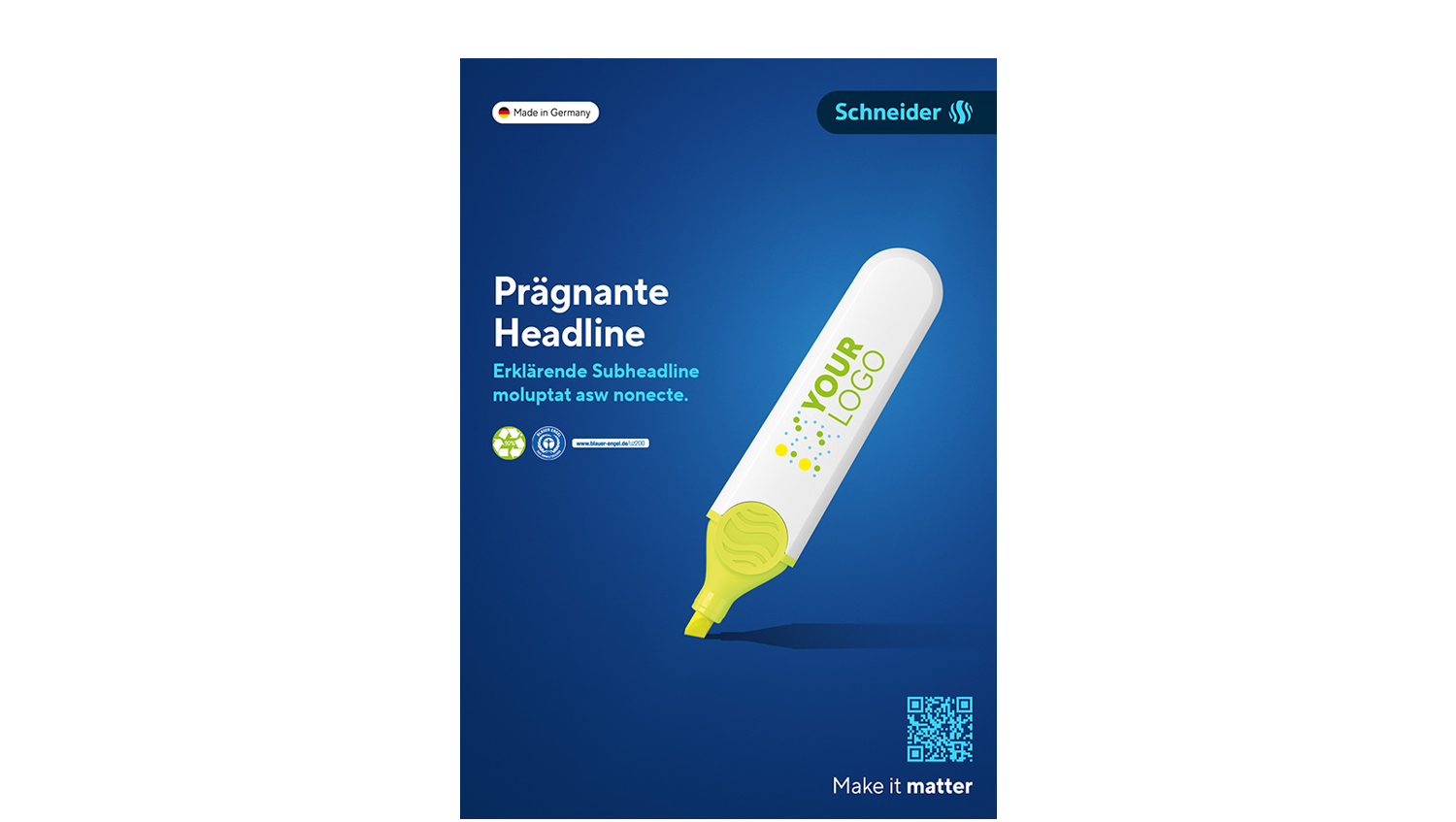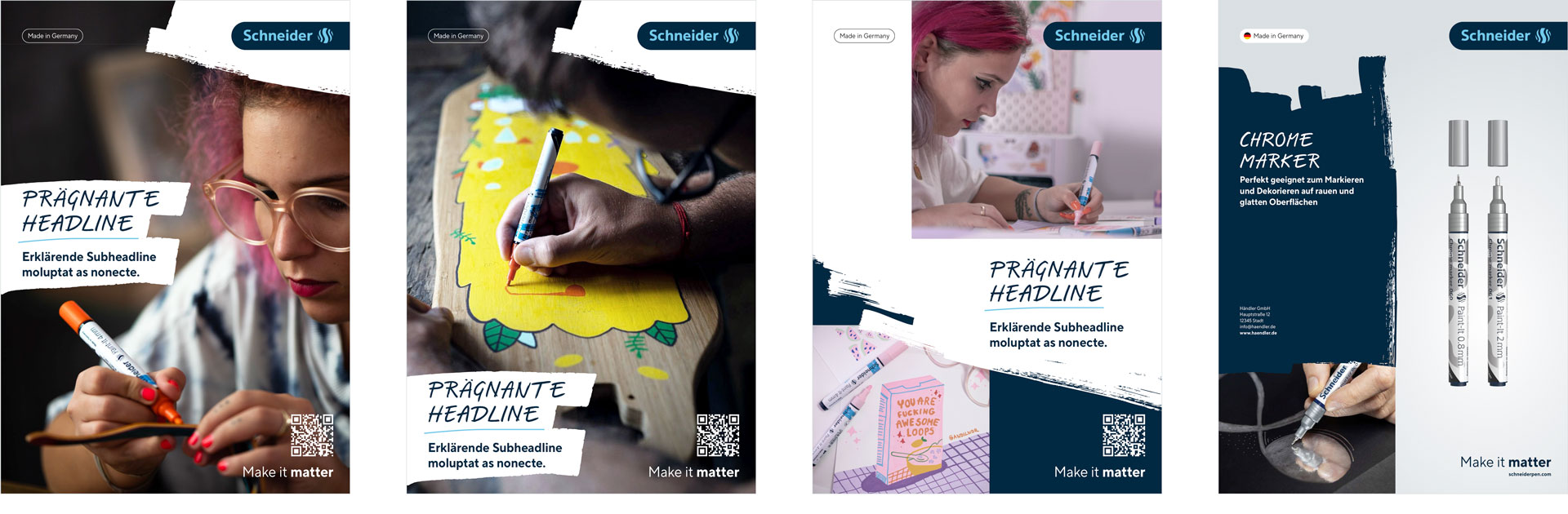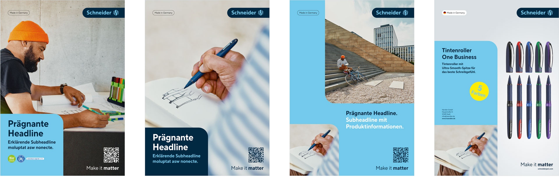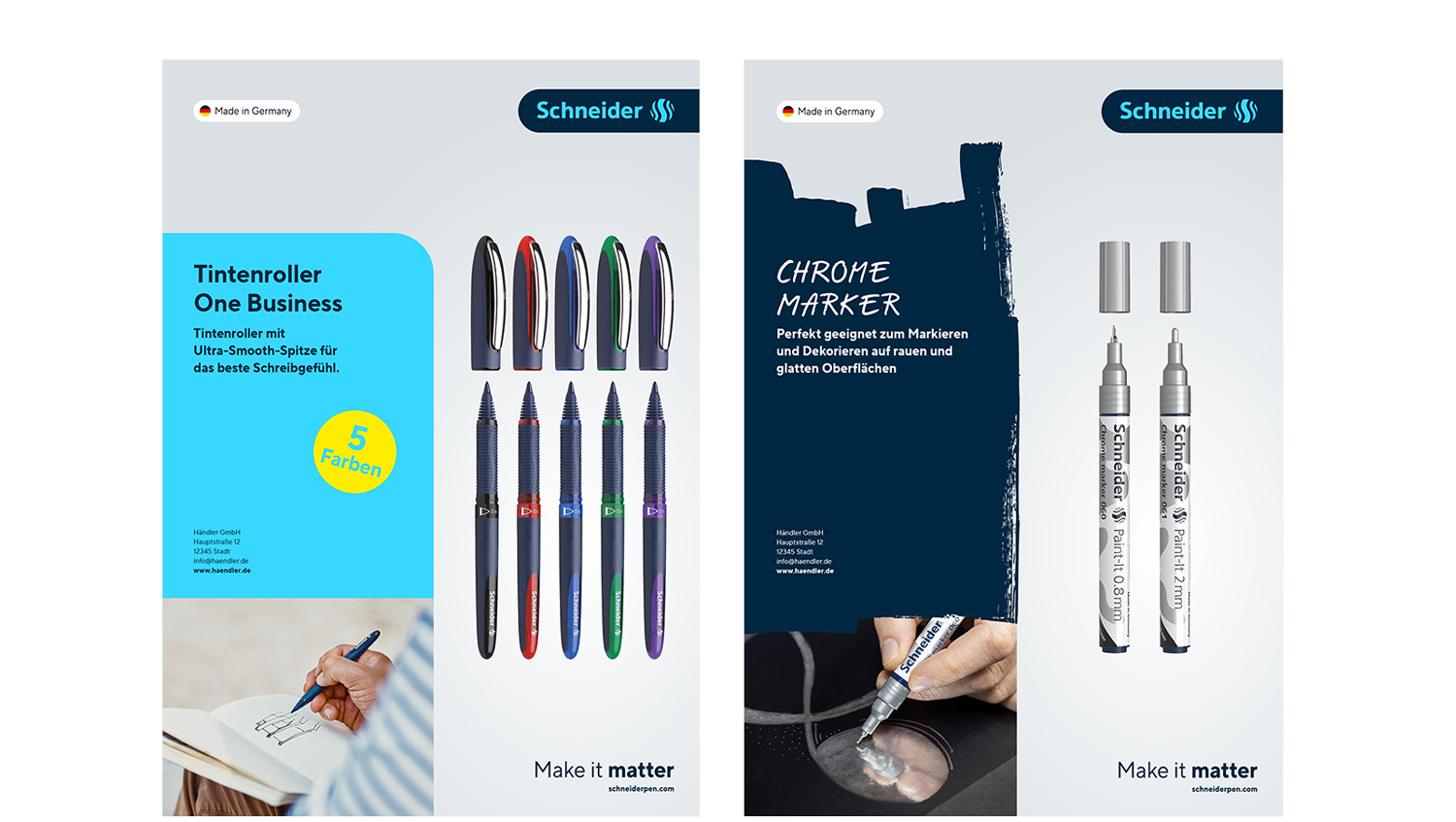 Für Händler, die einzelne oder mehrere konkrete Produkte bewerben möchten, gibt es für die Produktbereiche Write und Create ein eigenes Anzeigenformat. Hier liegt der Schwerpunkt auf den Produkten und deren Verkauf. Produktdarstellungen können dabei optional durch Anwendungsbilder ergänzt werden. Wichtig: Das „Made in Germany Signet – Sales“ ist immer Bestandteil des Layouts. Außerdem wird anstelle des QR-Codes die URL gesetzt. In der Mustervorlage mit dem Namen „retailer“ sind bereits alle Designelemente enthalten und CI-konform angelegt.