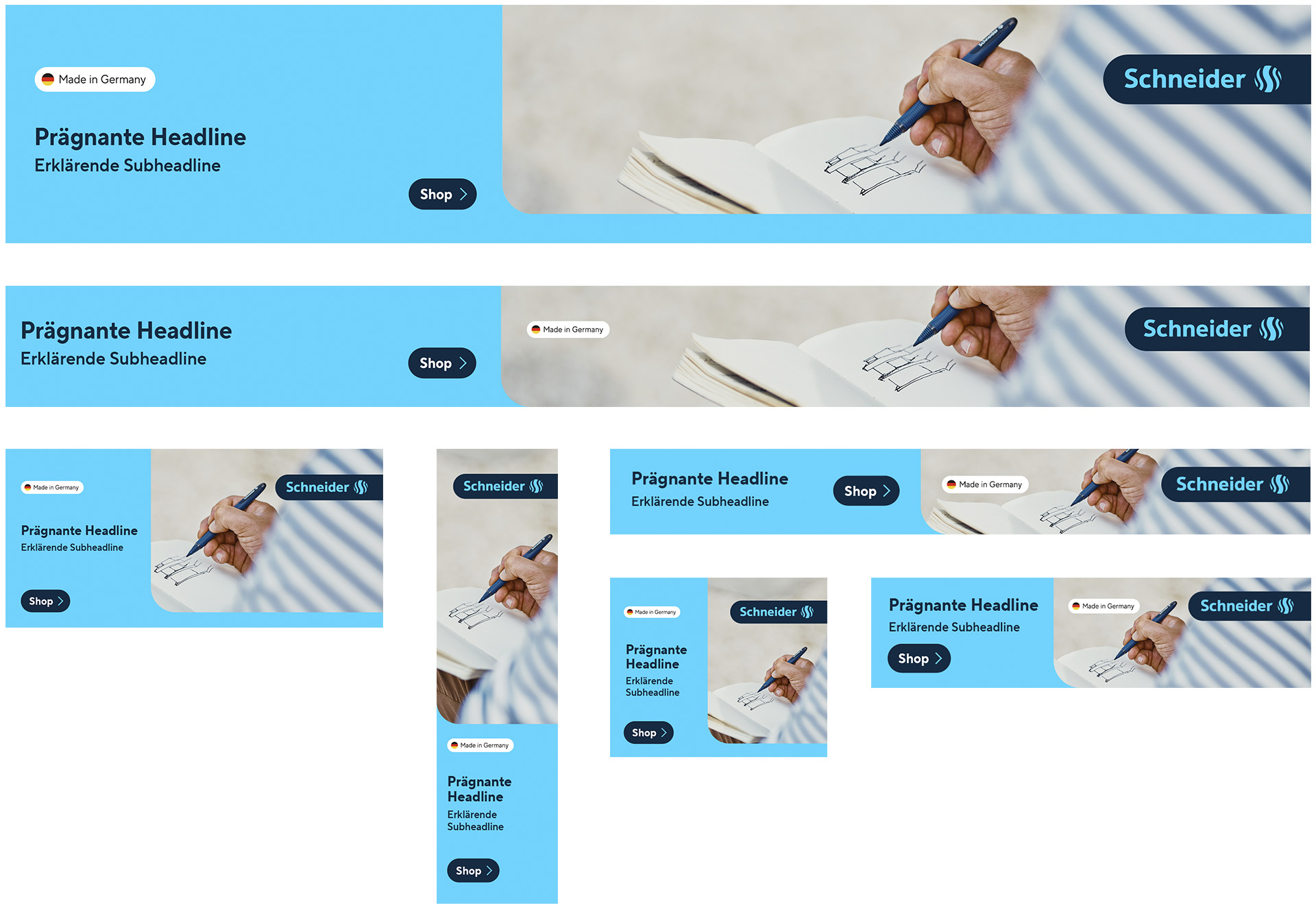 Das Layoutprinzip ist sehr flexibel, sodass es auf verschiedenste Formate übertragbar ist. Alle Anzeigentypen stehen in vier Standardformaten als Vorlagendatei zur Verfügung.