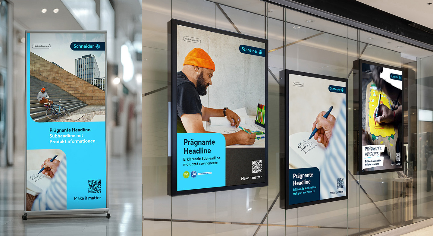 Skaliert vom Kleinen aufs Große: Das Layoutprinzip der Anzeigen im 1/1-Format ist auch die Basis für weitere Kommunikationsmittel im Out-of-Home-Bereich oder am Point-of-Sale. Dazu zählen zum Beispiel Plakate und Roll-ups.