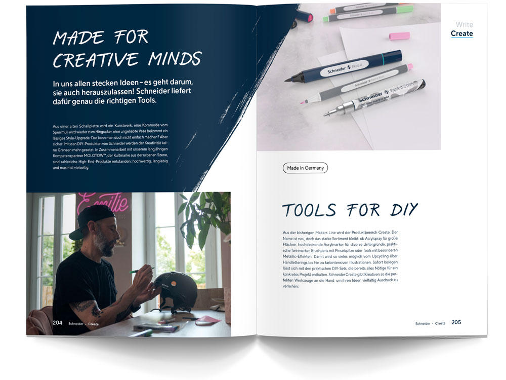 Rebellisch, unkonventionell und mit einer ganz eigenen Handschrift: Der Schneider Create Font spiegelt das Individuelle, das Selbstgemachte wider. Die Schrift wurde von unserer Markenagentur eigens entworfen und transportiert den DIY-Gedanken dieses Produktbereichs. Der Font wird stets auf Brush-Elementen platziert.