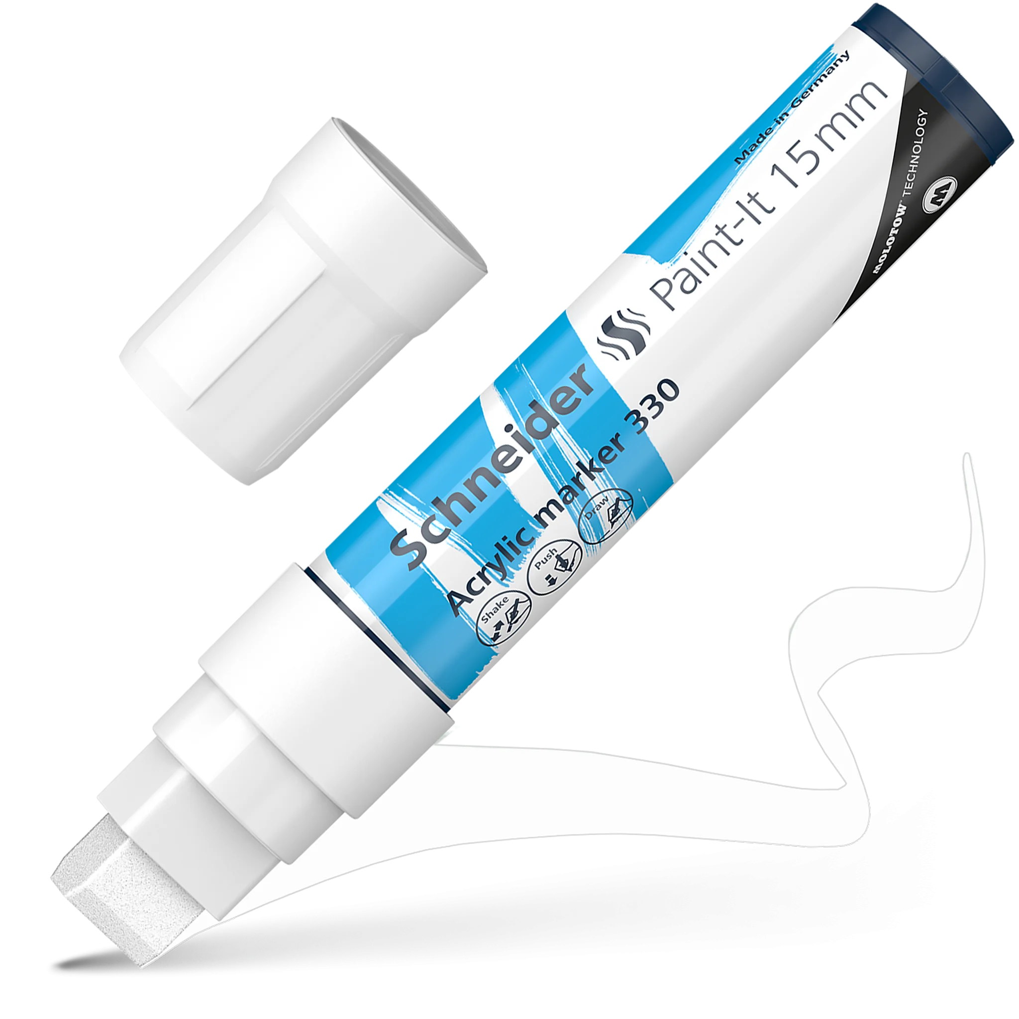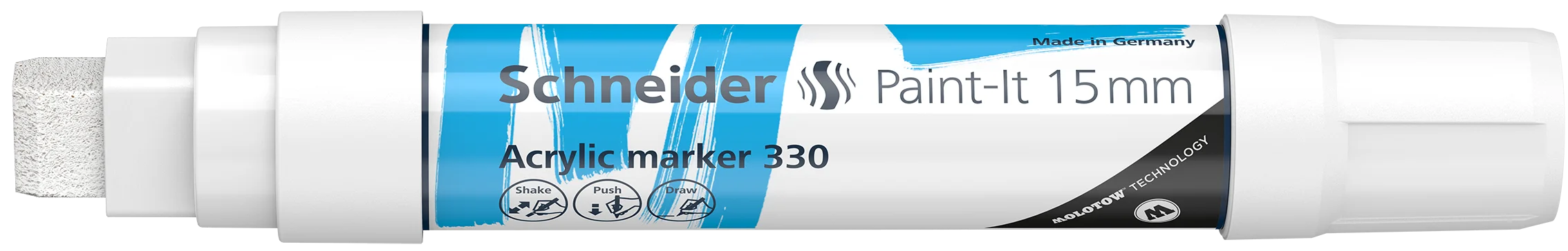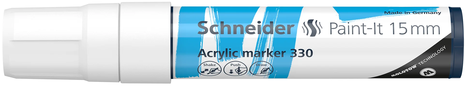 Acrylmarker 15 mm für kreatives Arbeiten. Schreibfarbe weiß. Das Werkzeug für jedes deiner Projekte. Hochdeckend, schnelltrocknend und hohe Farbbrillanz. Die optimierte Tinte ist für nahezu jeden Untergrund geeignet: Holz, Metall, Papier, Karton, Stein, etc. Die wasserbasierte und geruchsarme Tinte wird durch ein Ventil perfekt gesteuert. So wie du es brauchst.