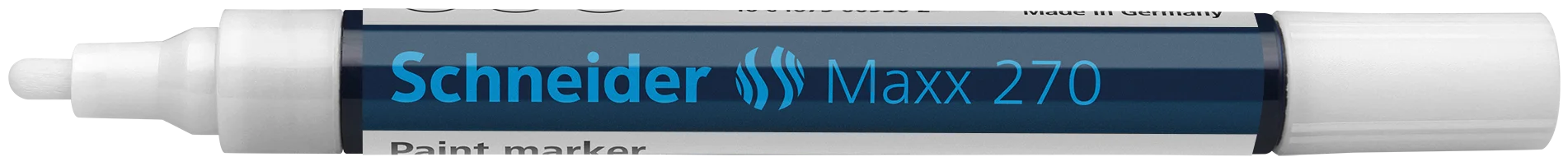 Marqueur peinture avec pointe ogive pour épaisseur de trait environ 1-3 mm. Couleur d'encre blanche. Idéal pour marquer et décorer des surfaces rugueuses et lisses, comme par ex. papier, plastique, verre, métal, céramique, etc. Fort pouvoir couvrant, forte adhérence et résistance à l´abrasion sur presque tous les matériaux. L'encre est résistante à la lumière, à l´eau et au temps, résistante à la chaleur jusqu´à 300° C et résistante à la corrosion et au lavage. Le débit d´encre est modulé par valve, sans toluène et xylène. Chaque marqueur est soudé sous film, pointe interchangeable.