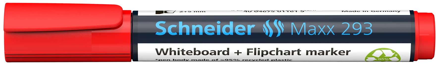 Marqueur deux en un: pour tableau blanc et paper board avec pointe biseautée smart-radial pour épaisseur de trait 2+5 mm. Couleur d'encre rouge. *Le corps est en plastique recyclé à 95%. L'écriture de couleur forte et intensive - utilisée sur le tableau ou sur le papier - est bien lisible aussi dans les derniers rangs. L'encre est éffaçable à sec sans résidu sur les tableaux blancs et ne traverse pas les pages suivantes sur paper boards. Le modèle cap-off peut rester ouvert pendant 2-3 jours sans sécher. L'encre est faible en odeur, sans toluène et xylène. La nouvelle forme volumineuse présente un marquage maximale et la nouvelle pointe ogive garantit un marquage doux sans grincer. Le Maxx 293 a un capuchon avec clip pratique et est rechargeable avec le flacon d´encre 665 refill station.