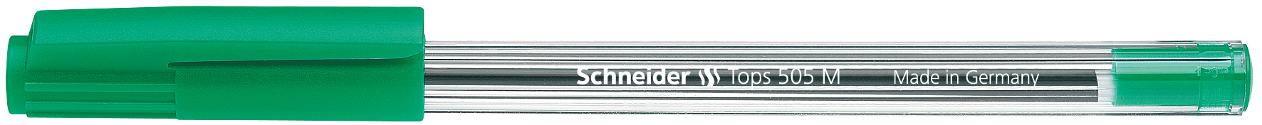 Kugelschreiber mit umsteckbarer Clipkappe. Schreibfarbe grün, erkennbar an Kappe und Stopfen. Strichstärke Medium (M), ca. 0,5 mm. Transparenter Schaft für Tintenstandkontrolle. Die verschleißfeste Edelstahlspitze garantiert, dass der große Pastenvorrat vollständig und schmierfrei genutzt werden kann.