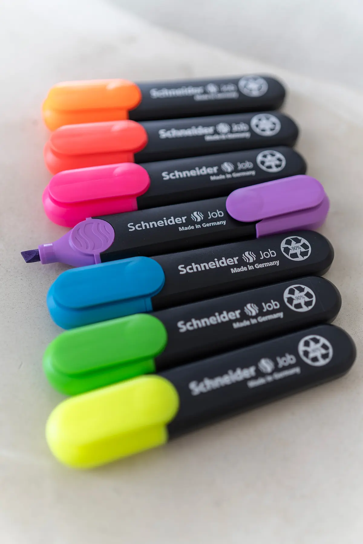 Der Textmarker Job ist in sieben leuchtenden Neonfarben erhältlich: fluo rot, blau, grün, gelb, orange, pink und lila. Diese Farben sind in 4er, 6er und 8er Etuis sowie in 1er Blistern und in einem ansprechenden Display mit 150 Textmarkern verfügbar.