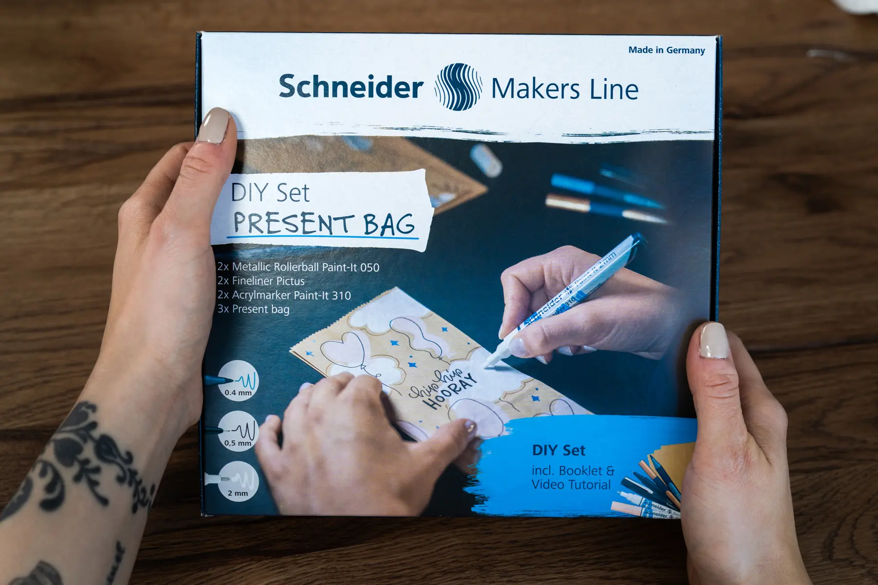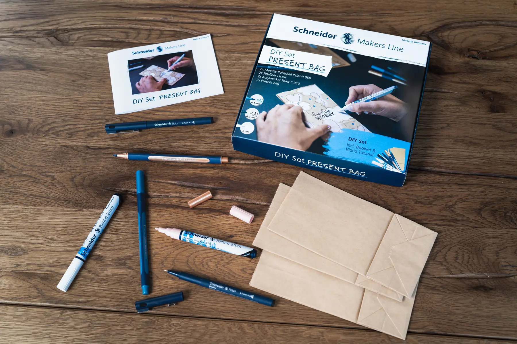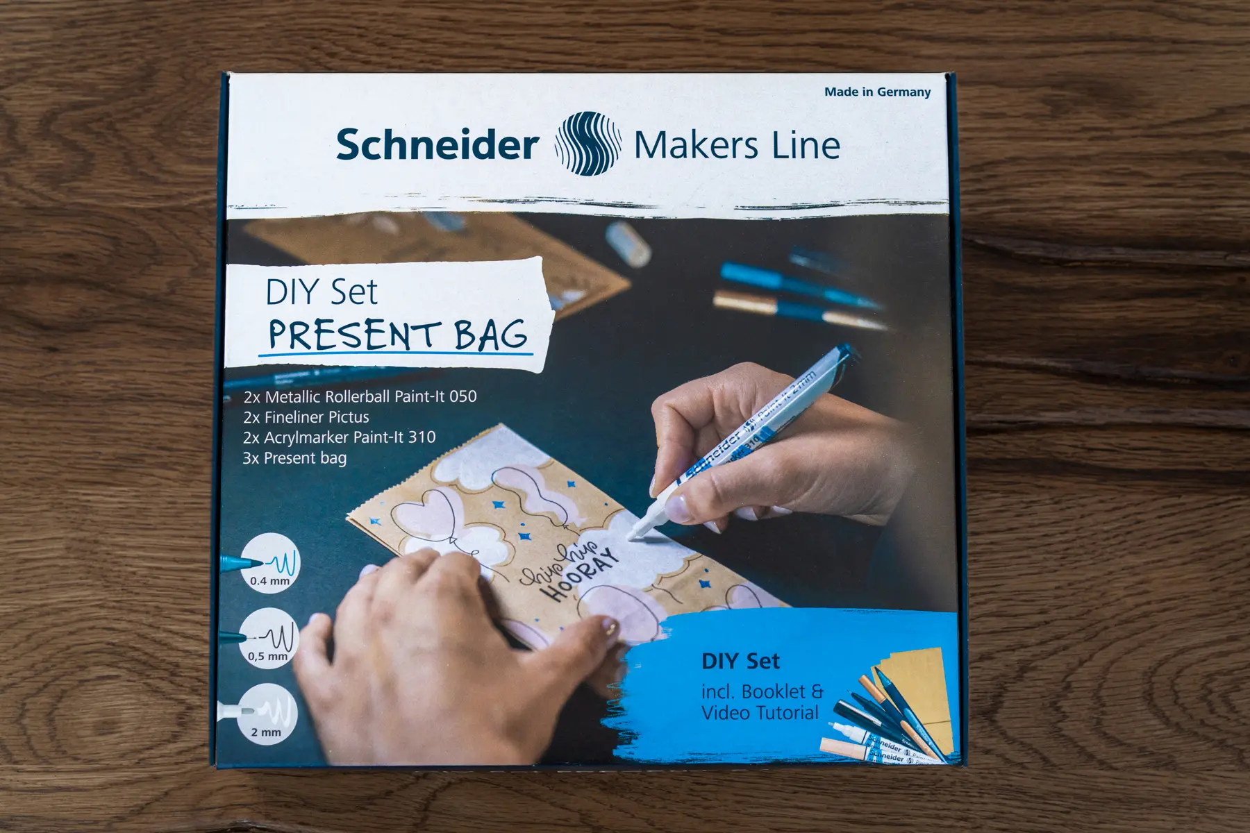 Jeder kommt in die Situation, dass noch schnell Geschenke auf eine besondere Weise verpackt werden müssen. Das Schneider DIY-Set für Geschenktüten bietet die Möglichkeit, eigene kunstvolle Tüten-Unikate zu gestalten. Mit Acrylmarkern, Pigmentlinern und einer Vielzahl anderer Materialien kann jeder seine Kreativität entfalten und dem Geschenk durch die Verpackung seine ganz eigene Note verleihen (2 × Acrylmarker Paint-It 310 in weiß, apricot, 2 × Paint-It 050 Metallic Rollerball in polar blue metallic, copper metallic, 2 × Fineliner Pictus in 0.2 mm schwarz, 0.7 mm schwarz, 3 × Geschenktüte Papier 180 ×90 × 55 mm, 1 × Booklet DIY Set Geschenktütchen).