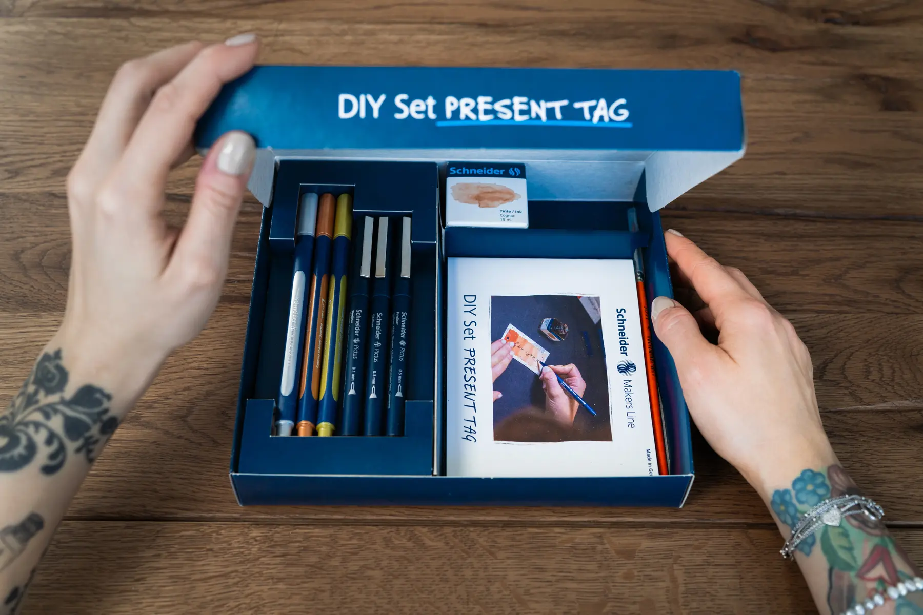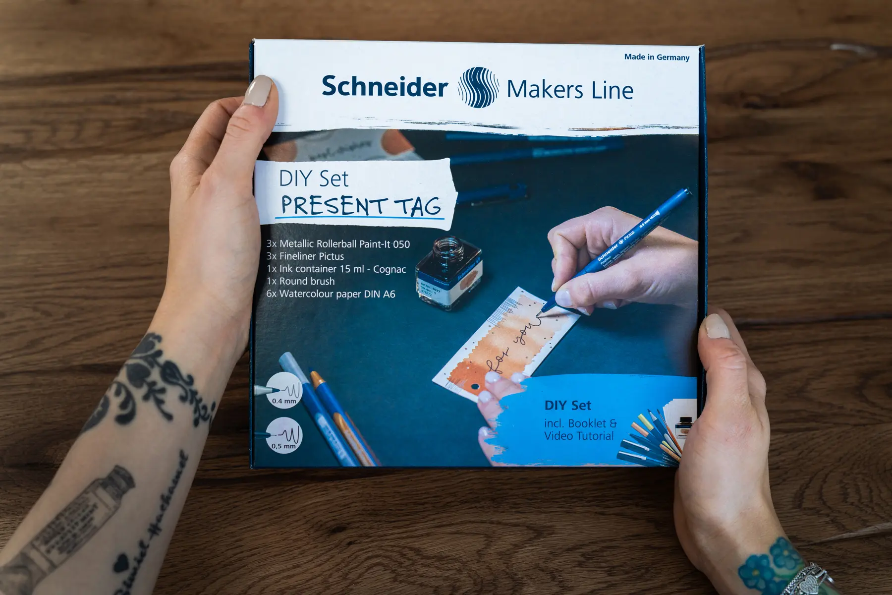 Seinen Geschenken eine eigene Handschrift mitzugeben ist möglich mit selbst gestalteten Geschenkanhängern. Das DIY-Set beinhaltet alles Notwendige, um außergewöhnliche und unvergessliche Präsent-Anhänger anzufertigen. Mit Metallic-Rollerballs, Pigmentlinern und Aquarellpapier kann Kreativität ausgelebt werden (3 × Fineliner Pictus in 0.1 mm schwarz, 0.3 mm schwarz, 0.5 mm schwarz, 3 × Paint-It 050 Metallic Rollerball in silver metallic, gold metallic, copper metallic, 1 × Tintenglas Pastell in cognac, 1 × Pinsel, 1 × 6er Set Aquarellpapier DIN A6, 1 × Booklet DIY Set Geschenkanhänger).