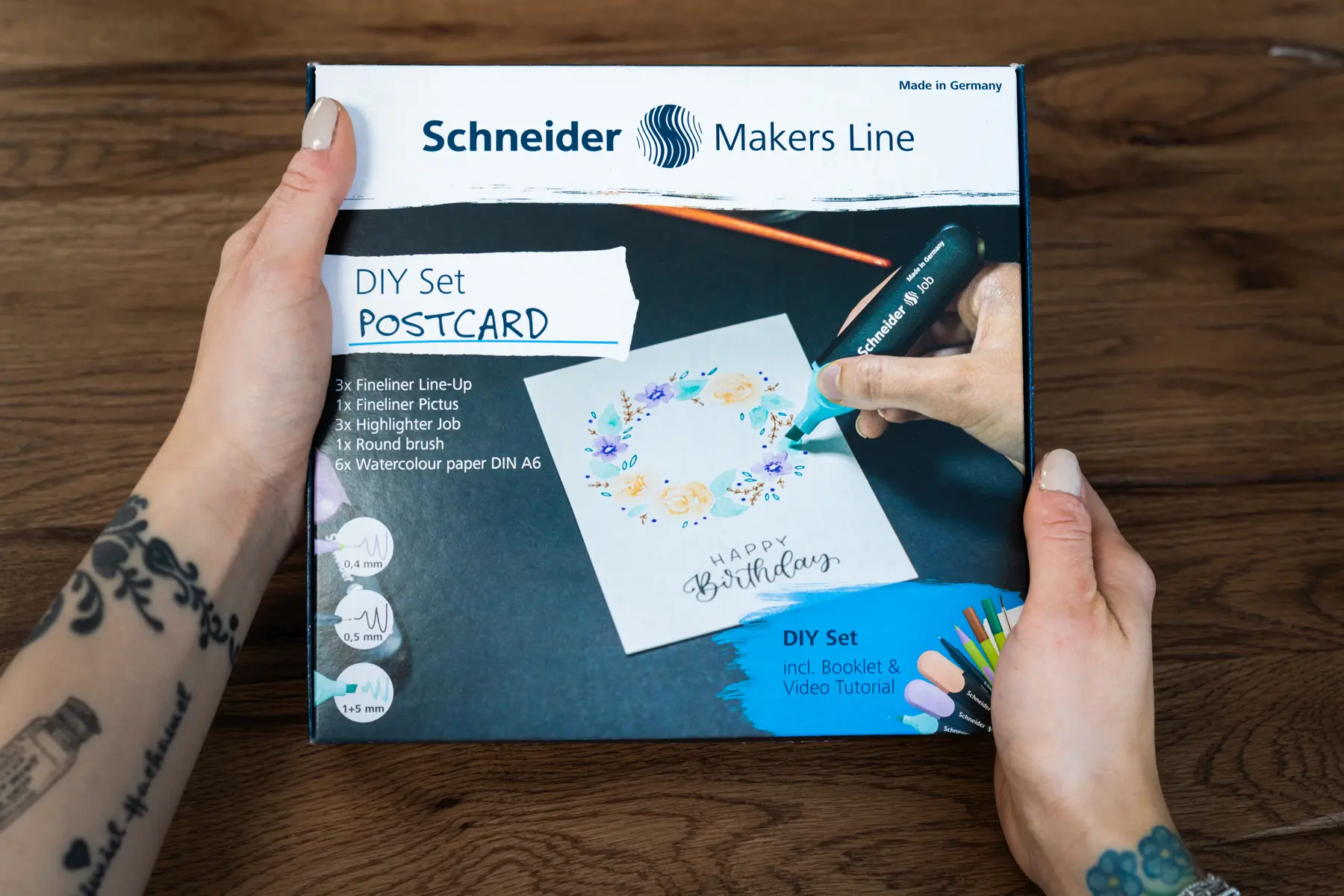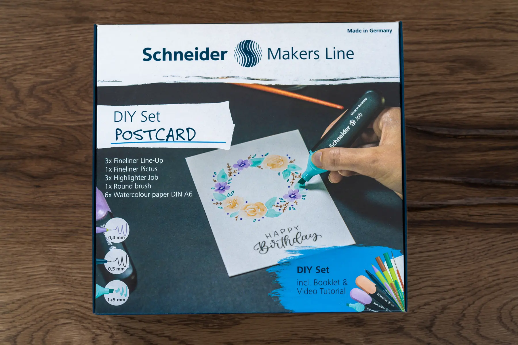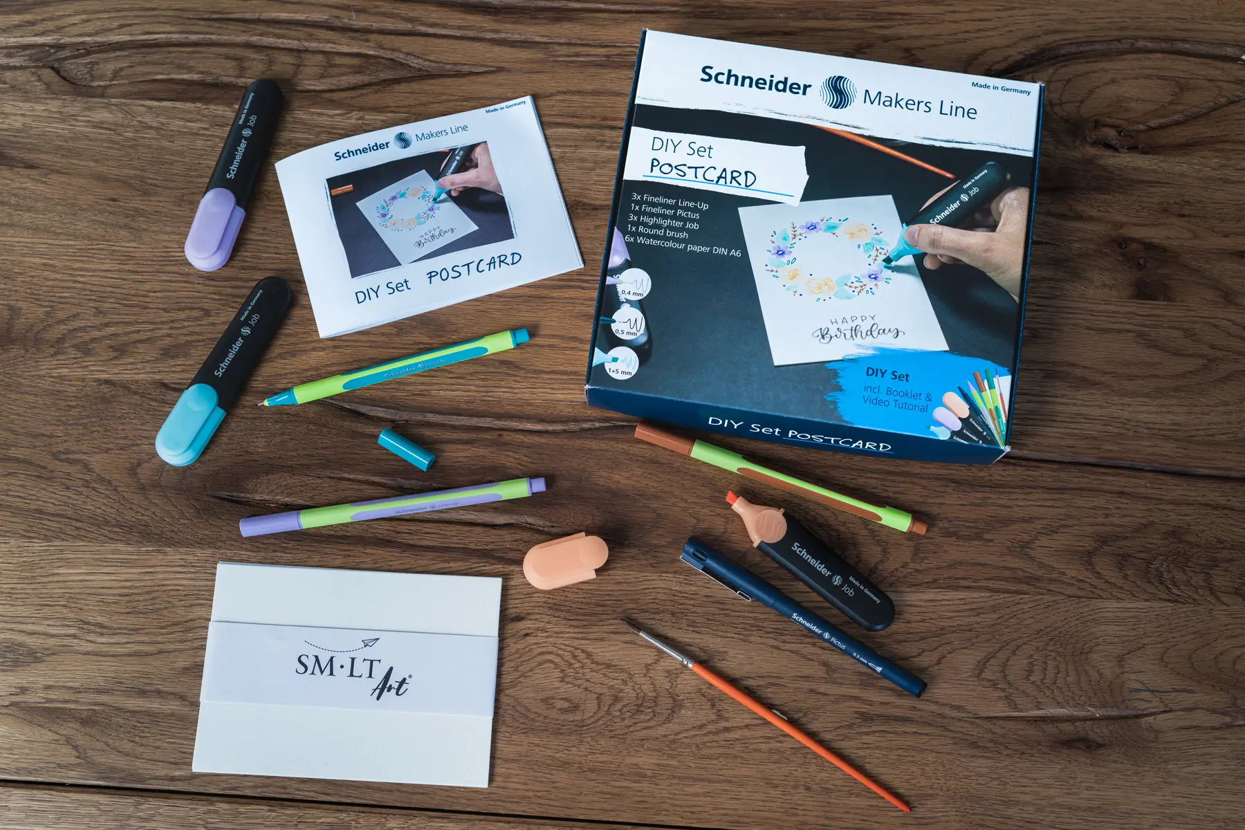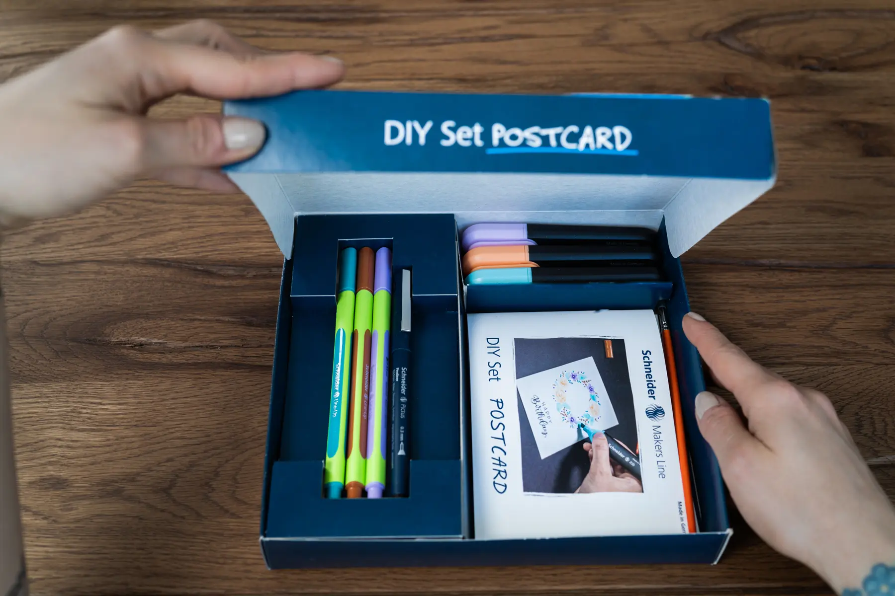 Das Postkarten-DIY-Set ermöglicht es die eigene künstlerische Ader zu entfalten und bei Bedarf schnell reagieren zu können. Mit verschiedenen Motiven und persönlichen Botschaften können individuelle Postkarten zu allen denkbaren Anlässen kreiert werden. Das Set enthält alles, was man dazu braucht, von Textmarkern über Fineliner bis hin zu Aquarellpapier (3 × Textmarker Job in türkis, pfirsich, flieder, 3 × Fineliner Line-Up in pastel-lilac, mahogany-brown, nautic-green, 1 × Fineliner Pictus 0,3 in schwarz, 1 × Pinsel, 1 × 6er Set Aquarellpapier DIN A6, 1 × Booklet DIY Set Postkarte).