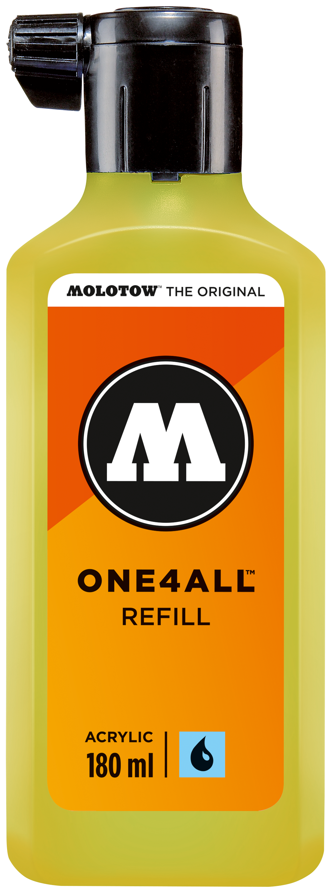 Nachfülleinheit 180 ml Tinte auf Wasserbasis passend zur One4All Serie. Schreibfarbe: neongelb fluoreszierend. Unerreichte Deckkraft und leuchtende Farben. Verdünnbar mit Wasser oder Aceton (1-3%). Seidenmatt, hochdeckend, permanent, schnelltrocknend und gute UV-Beständigkeit .Auf nahezu allen Untergründen anwendbar. Bedingt mischbar. All dies machte die ONE4ALL Marker-Serie zum Shootingstar im Kunst- und Design-Bereich. Erhältlich in 44 Farben.