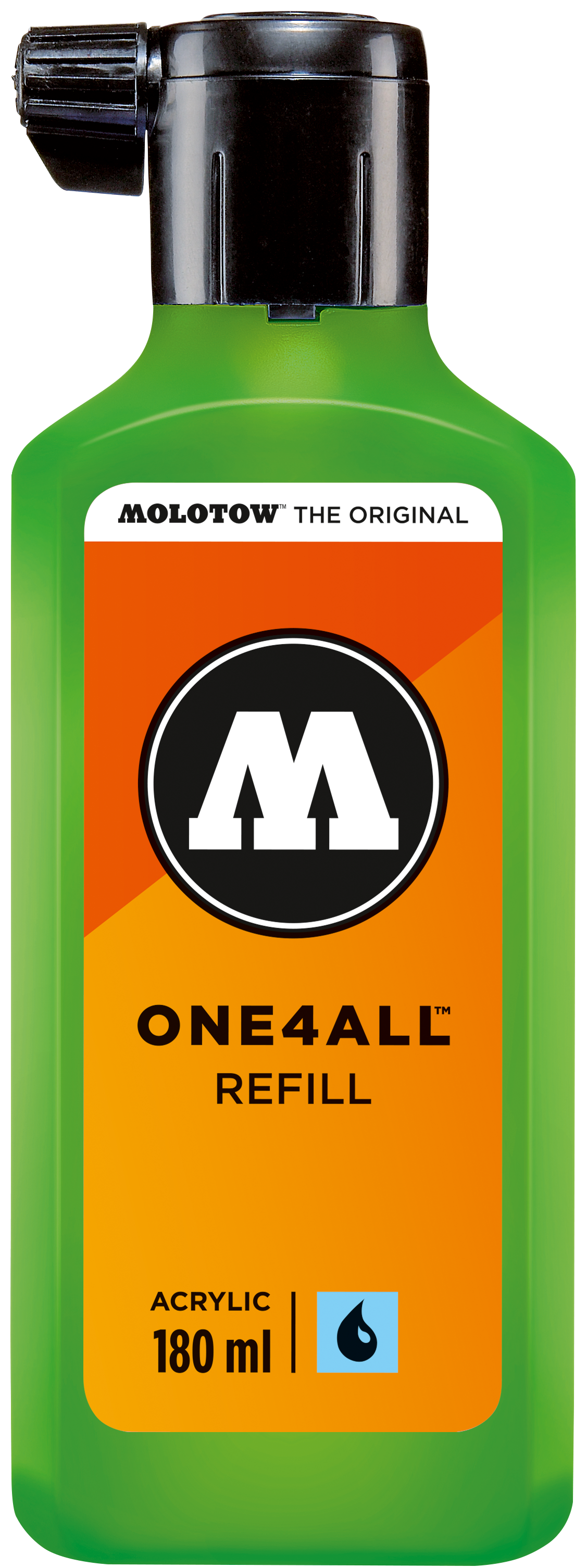 Nachfülleinheit 180 ml Tinte auf Wasserbasis passend zur One4All Serie. Schreibfarbe: KACAO77 UNIVERSES green. Unerreichte Deckkraft und leuchtende Farben. Verdünnbar mit Wasser oder Aceton (1-3%). Seidenmatt, hochdeckend, permanent, schnelltrocknend und gute UV-Beständigkeit .Auf nahezu allen Untergründen anwendbar. Bedingt mischbar. All dies machte die ONE4ALL Marker-Serie zum Shootingstar im Kunst- und Design-Bereich. Erhältlich in 44 Farben.