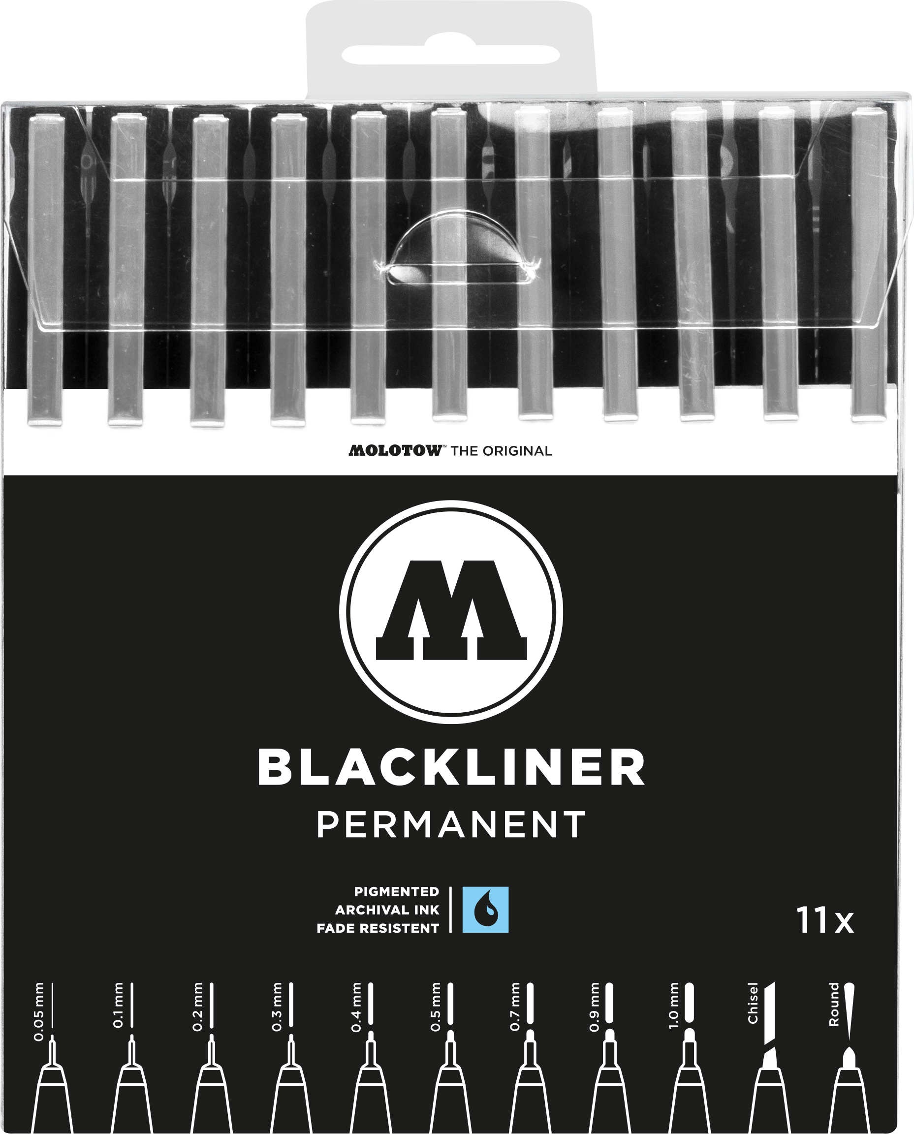 Zum Skizzieren, für die Schule, für Outlines oder als einfacher Fineliner: die Blackliner Made in Germany haben eine dokumentenechte Tinte auf Wasserbasis und sind obendrein wasser- und chemikalienbeständig. Die robusten, metallgefassten Spitzen von 0.05 mm - 1 mm, Chisel und Round garantieren feine und exakte Linien und sind somit ideal für Outlines geeignet. Die Blackliner sind hochwertig ausgestattet und haben eine griffige, matte Oberfläche.
