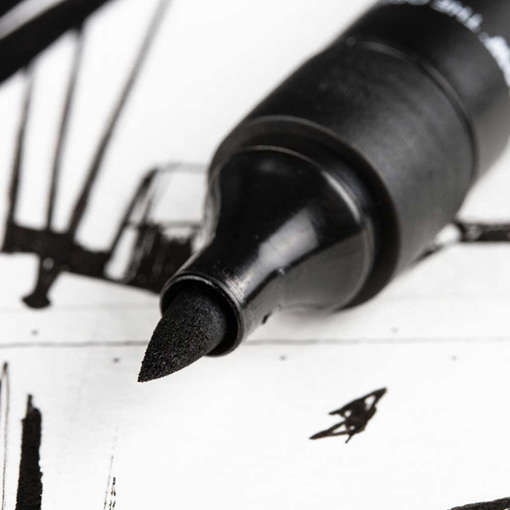 Der neue Blackliner Brush hat die gleichen permanenten, dokumentenechten Tinteneigenschaften wie die restlichen Blackliner. Mit einem größeren Body und einer breiteren Pinselspitze ist der Marker ideal zum Kolorieren von größeren Flächen. Mit dem Blackliner Brush lassen sich Handlettering und Kalligrafie prima umsetzen. Die absolute Besonderheit: die deckende Tinte ist auf Wasserbasis und trotzdem wasser- und chemikalienbeständig, sowie ausbleichsicher. 1 Farbton: schwarz.