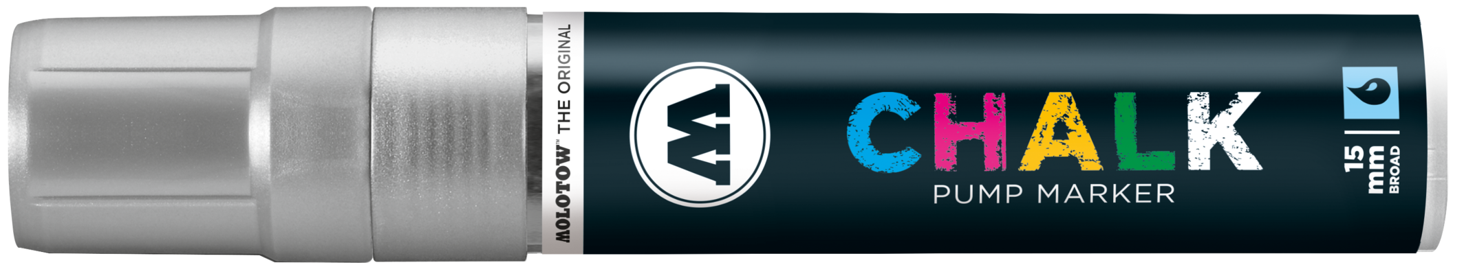 Kreidemarker mit austauschbarer 15 mm Spitze perfekt für temporäre Anwendungen auf nahezu allen nicht saugenden und glatten Untergründen oder Kunstanwendungen auf Leinwand. Schreibfarbe: metallic silber. Geeignet für Schaufenster, Spiegel, Glas, Fließen, Metall, Plastik, Schiefertafeln und Leinwand. Erhältlich in 10 Farben. Wiederbefüllbar mit allen CHALK Refills. Made in Germany.