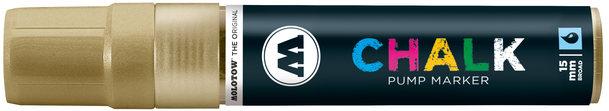 Kreidemarker mit austauschbarer 15 mm Spitze perfekt für temporäre Anwendungen auf nahezu allen nicht saugenden und glatten Untergründen oder Kunstanwendungen auf Leinwand. Schreibfarbe: metallic gold. Geeignet für Schaufenster, Spiegel, Glas, Fließen, Metall, Plastik, Schiefertafeln und Leinwand. Erhältlich in 10 Farben. Wiederbefüllbar mit allen CHALK Refills. Made in Germany.