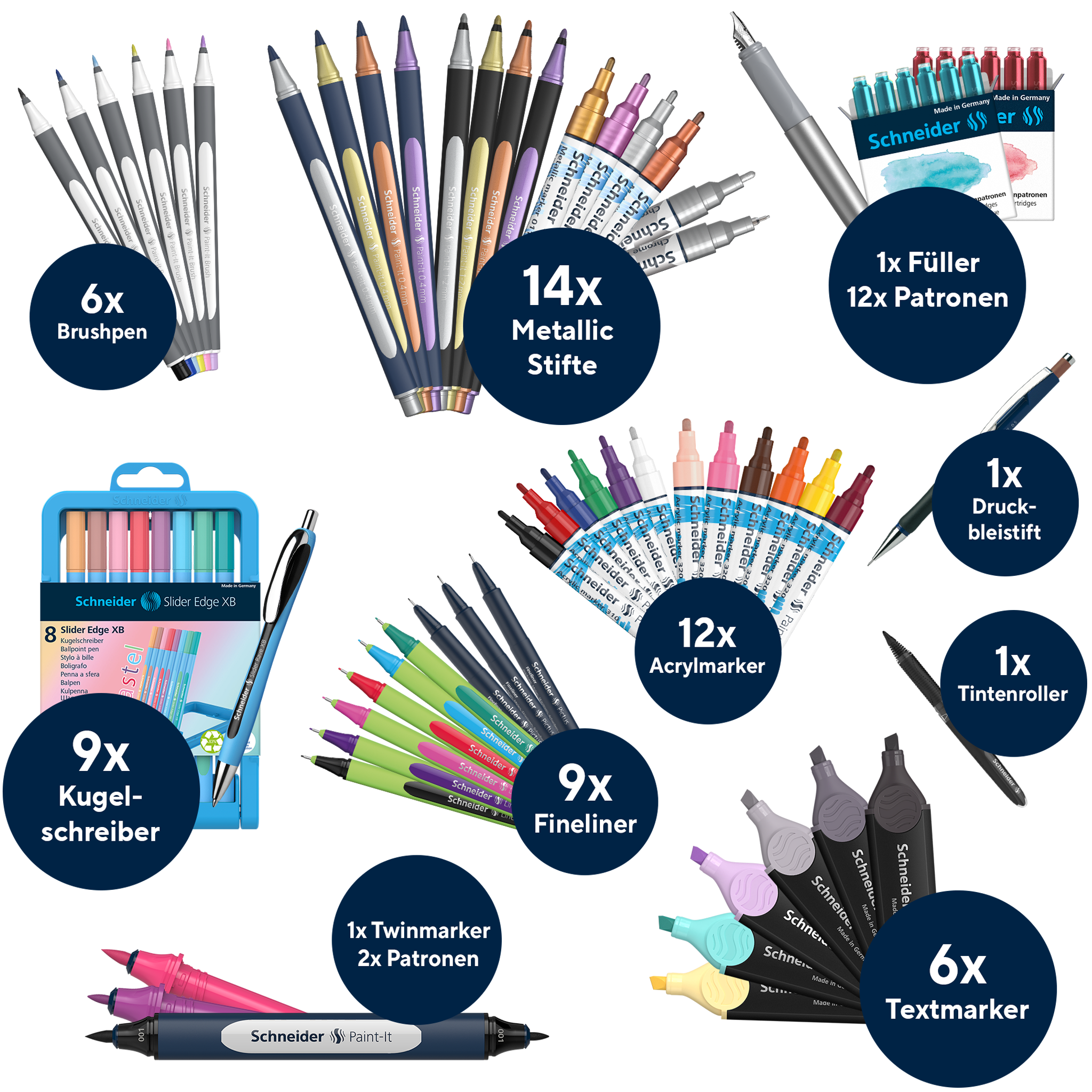 - Enthält Kugelschreiber, Füller, Textmarker, Fineliner und Marker