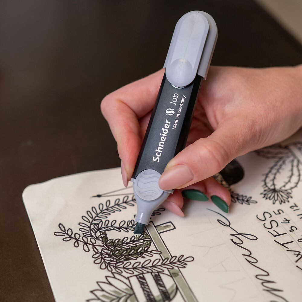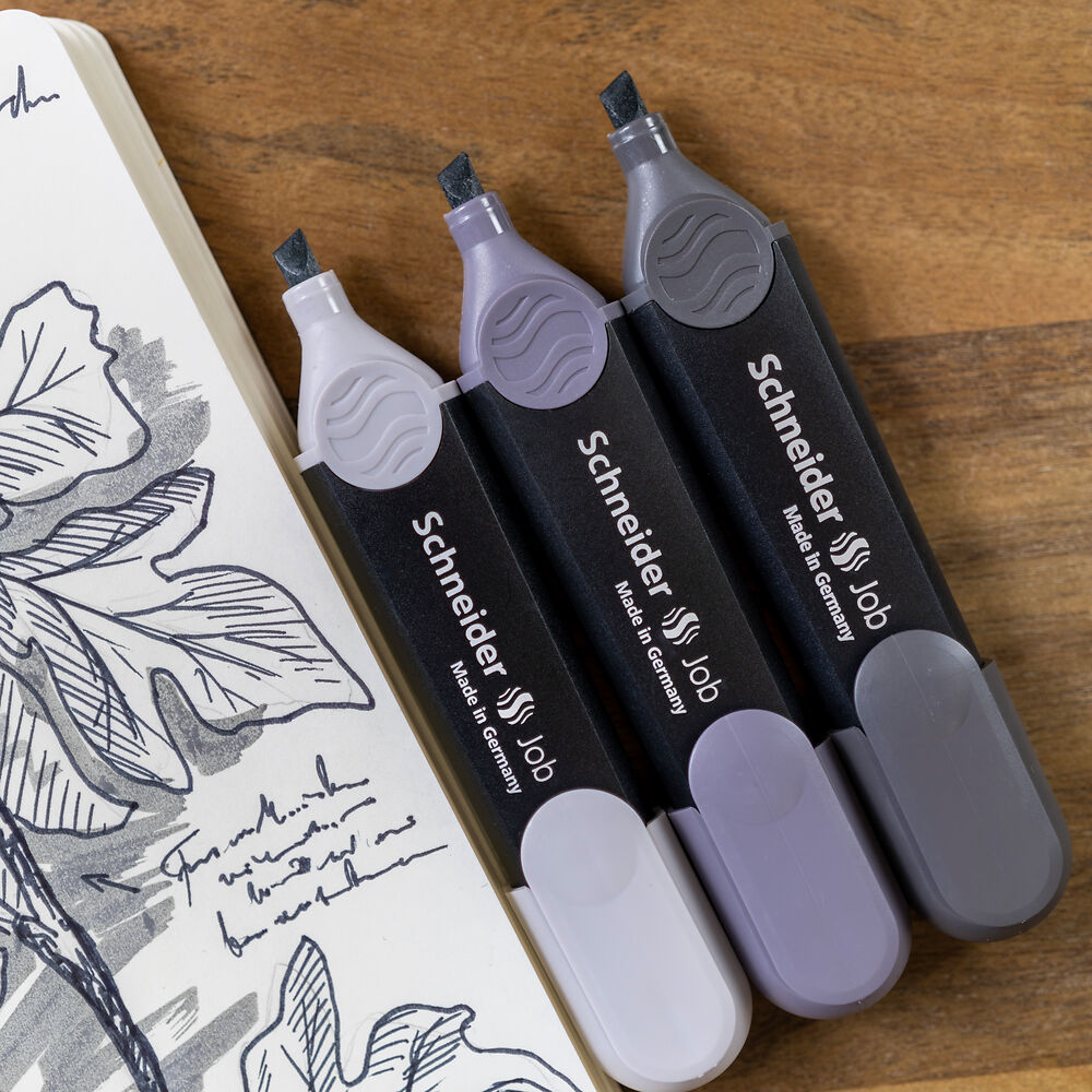 Textmarker mit Keilspitze für zwei Strichstärken, 1+5 mm. Set bestehend aus schiefergrau, mauvegrau und taupegrau + 1x taupegrau gratis. Der Textmarker Job ist der erste Textmarker aus über 90% Recyclingmaterial, welcher mit dem weltbekannten Umweltzeichen „Blauer Engel“ ausgezeichnet wurde. Das Gehäuse, sowie der innenliegende Speicher und die Spitze, bestehen aus recyceltem Kunststoff. Die Tinte ist biobasiert. Die Universaltinte ist für Normal-, Kopier- und Faxpapier. Damit empfiehlt sich der Job Textmarker in der Schule, im Studium oder im Büro und ist mit seiner Keilspitze zudem auch für kreatives Arbeiten im Bullet Journal oder zum Kalligraphieren beim Handlettering perfekt geeignet. Mit seinem großen Tintenvorrat markiert der Job mehr als 15.000 Worte.