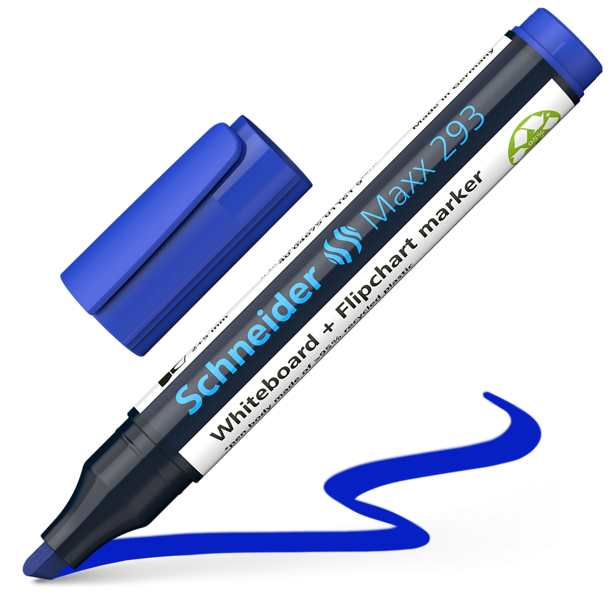 Whiteboard- und Flipchart-Marker mit innovativer Smart-Radial Keilspitze für Strichstärke 2+5 mm. Schreibfarbe blau. *Gehäuse besteht aus 95% Recycling-Kunststoff. Die kräftige farbintensive Schrift ist auf Tafel und Papier auch in hinteren Reihen gut lesbar. Sie ist von Whiteboards rückstandsfrei trocken abwischbar und schlägt bei Flipcharts nicht auf nachfolgende Seiten durch. Die Cap-Off-Tinte trocknet nicht ein, auch wenn der Marker 2-3 Tage offen bleibt. Sie ist geruchsarm und frei von Toluol und Xylol. Das neue voluminöse Format bietet höchste Markierleistung und die neue Keilspitze schreibt angenehm weich ohne nervendes Quietschen. Der Maxx 293 hat eine praktische Clipkappe und ist nachfüllbar mit der Maxx 665 refill station.
