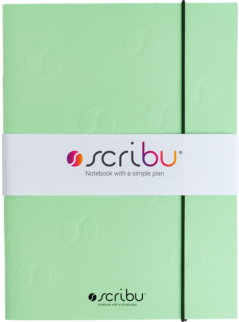 Intelligentes Notizbuch aus durchgefärbtem Naturpapier mit 96 Seiten Inhalt und schwarzem, textilumflochtenen Gummiband.scribu – Das intelligente Notizbuch für moderne Selbstorganisation