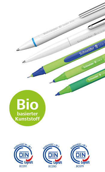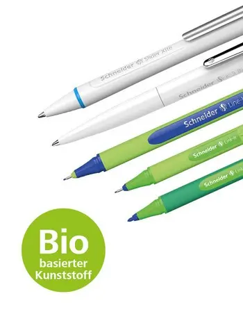Das Recycling von Kunststoffprodukten und Abfällen ist definitiv eine sinnvolle Lösung, um die Ressource Erdöl zu schonen und um gleichzeitig Müll zu vermeiden. Nichts desto trotz reicht das Recyceln von Kunststoffen nicht aus, um den Bedarf an Kunststoff weltweit zu decken. Schneider verwendet seit vielen Jahren biobasierte Kunststoffe und leistet in diesem Bereich Pionierarbeit. Biobasierte Kunststoffe weisen für Schreibgeräte dieselben großartigen Eigenschaften wie herkömmliche Kunststoffe auf und stellen demnach eine gleichwertige und langfristige Alternative dar.