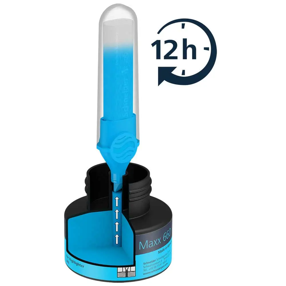 Estación de recarga para el resaltador Schnedier Job. Contenido: 30 ml de tinta azul. Simplemente meter el resaltador en el sistema y se llena automáticamente. Un llenado excesivo no es posible.