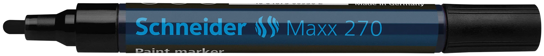 Marcador de laca para un ancho de trazo fuerte 1-3 mm. Tinta negra. Ideal para marcar y decorar casi todos los materiales, como, p. ej. papel, plástico, vidrio, metal, cerámica, cuero, caucho, etc. El resaltado es muy opaco, tiene buena adherencia a superficies pulidas y rugosas y resistencia a la abrasión en las mismas, es resistente a la luz, al agua y a la interperie y resistente a temperaturas de hasta 300 ºC. El flujo de tinta es regulado por válvula y sin tolueno y xileno. Con punta sustituible.