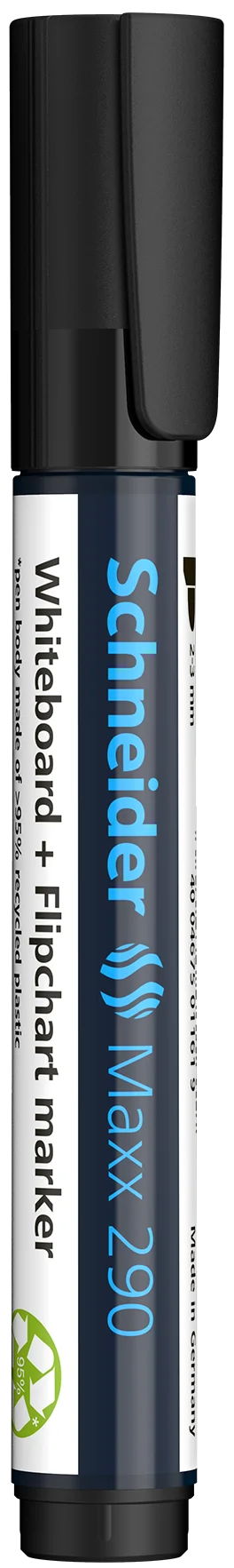 Marcador para pizarra blanca y flipchart, ancho de trazo 2-3 mm. Tinta negra. *Carcasa fabricada en plástico reciclado al 95%. La escritura de de colores intensos para mayor visibilidad en pizarra y papel, también visible en las filas posteriores. Borrado en seco sin residuos de pizarras blancas y no traspasa los folios del flipchart. La tinta “cap off” no se seca incluso si permanece destapado durante 2 ó 3 días. Es de poco olor sin tolueno ni xileno. El nuevo modelo voluminoso ofrece más tinta para un mayor rendimiento de escritura y la nueva punta redonda marca especialmente suave sin chirrido al escribir. El Maxx 290 tiene un capuchon con clip práctico y es recargable con el sistema de recarga Maxx 665 refill station.