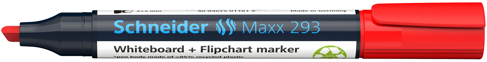 Marcador para pizarra blanca y flipchart, con punta biselada smart-radial, ancho de trazo 2+5 mm. Tinta roja. *Carcasa fabricada en plástico reciclado al 95%. La escritura de de colores intensos para mayor visibilidad en pizarra y papel, también visible en las filas posteriores. Borrado en seco sin residuos de pizarras blancas y no traspasa los folios del flipchart. La tinta “cap off” no se seca incluso si permanece destapado durante 2 ó 3 días. Es de poco olor sin tolueno ni xileno. El nuevo modelo voluminoso ofrece más tinta para un mayor rendimiento de escritura y la nueva punta biselada marca especialmente suave sin chirrido al escribir. El Maxx 293 tiene un capuchon con clip práctico y es recargable con el sistema de recarga Maxx 665 refill station.