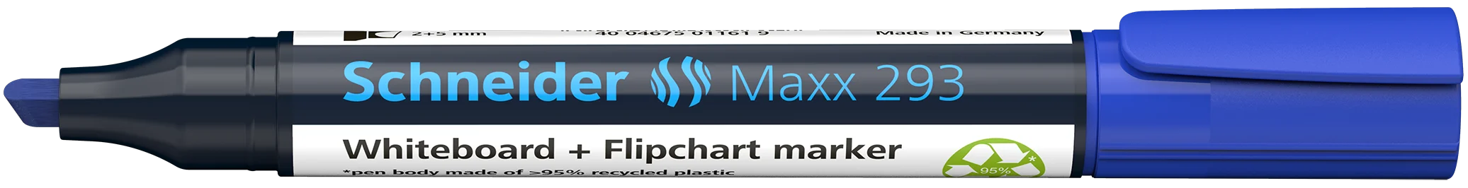 Marcador para pizarra blanca y flipchart, con punta biselada smart-radial, ancho de trazo 2+5 mm. Tinta azul. *Carcasa fabricada en plástico reciclado al 95%. La escritura de de colores intensos para mayor visibilidad en pizarra y papel, también visible en las filas posteriores. Borrado en seco sin residuos de pizarras blancas y no traspasa los folios del flipchart. La tinta “cap off” no se seca incluso si permanece destapado durante 2 ó 3 días. Es de poco olor sin tolueno ni xileno. El nuevo modelo voluminoso ofrece más tinta para un mayor rendimiento de escritura y la nueva punta biselada marca especialmente suave sin chirrido al escribir. El Maxx 293 tiene un capuchon con clip práctico y es recargable con el sistema de recarga Maxx 665 refill station.
