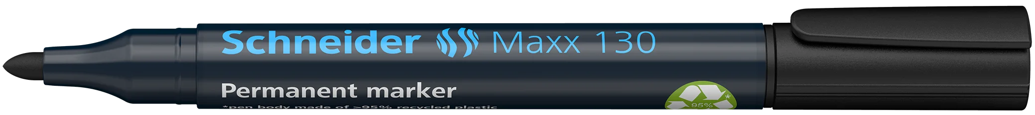 Marcador permanente con punta redonda, ancho de trazo 1-3 mm. Tinta negra. *Cuerpo hecho de 95% de plástico reciclado, el depósito interno de tinta está hecho de un 75% de fibras recicladas. Para casi todos los materiales, como, p. ej. cartón, papel, plástico, vidrio, madera, etc. La tinta de colores vivos seca rápidamente, es resistente al agua y a la luz. La tinta “cap off” no se seca incluso si permanece destapado durante 2 ó 3 días. Es de poco olor sin tolueno ni xileno. El marcador tiene un capuchon con clip práctico y es recargable con el sistema de recarga Maxx 640 refill station.