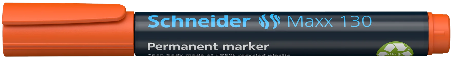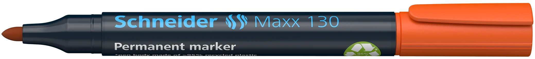Marcador permanente con punta redonda, ancho de trazo 1-3 mm. Tinta naranja. *Cuerpo hecho de 95% de plástico reciclado, el depósito interno de tinta está hecho de un 75% de fibras recicladas. Para casi todos los materiales, como, p. ej. cartón, papel, plástico, vidrio, madera, etc. La tinta de colores vivos seca rápidamente, es resistente al agua y a la luz. La tinta “cap off” no se seca incluso si permanece destapado durante 2 ó 3 días. Es de poco olor sin tolueno ni xileno. El marcador tiene un capuchon con clip.