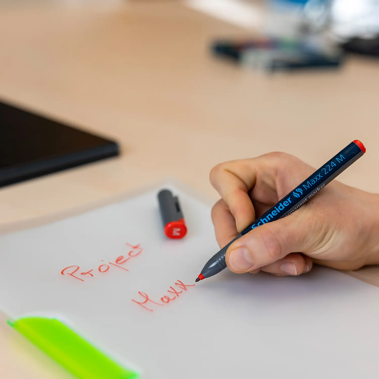 Marcador universal permanente, tinta roja, ancho de trazo medio (M) aprox. 1.0 mm. Para casi todos los materiales, como, p. ej. láminas transparentes, papel, plástico, vidrio, etc. La tinta de colores vivos seca rápidamente, es resistente al agua y a la luz. La tinta “cap off” no se seca incluso si permanece destapado durante 2 ó 3 días. Es de poco olor sin tolueno ni xileno. Modelo delgado de bolsillo y capuchón con clip práctico. El cuerpo* del bolígrafo es respetuoso con el medio ambiente y ahorra recursos, hecho con un 92% de plástico reciclado.
