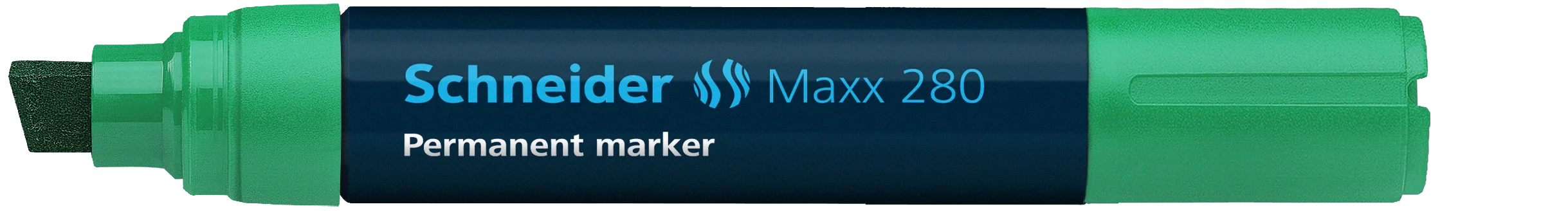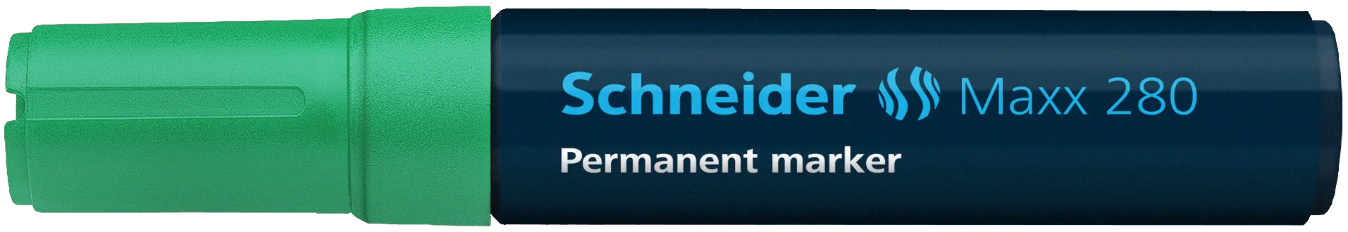 Marcador permanente con punta biselada, ancho de trazo 4+12 mm. Tinta verde. Para casi todos los materiales, como, p. ej. cartón, papel, plástico, vidrio, madera, etc. La tinta de colores vivos seca rápidamente, es resistente al agua y a la luz. La tinta “cap off” no se seca incluso si permanece destapado durante 2 ó 3 días. Es de poco olor sin tolueno ni xileno. Recargable con el sistema de recarga Maxx 650 botella de recarga.