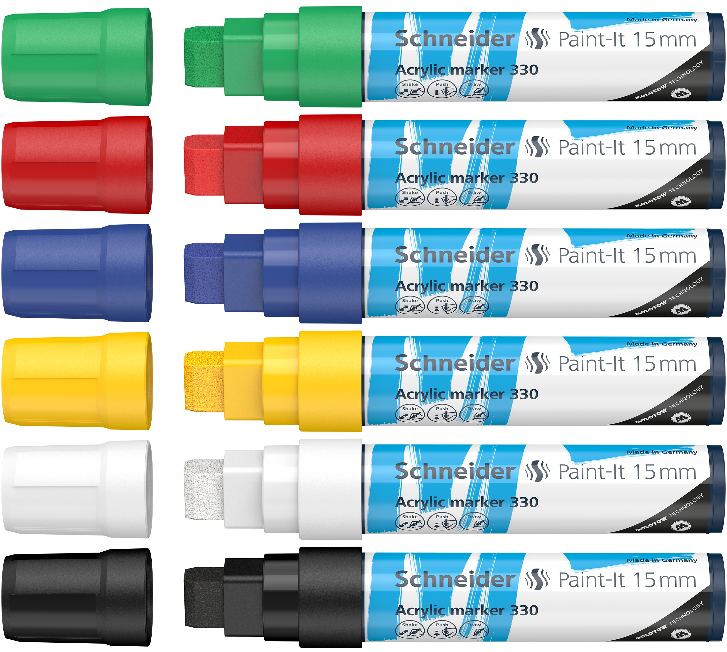 Marcador acrílico 4 mm para trabajos creativos. Estuche con 6 marcadores: negro, blanco, azul, violeta, rojo, verde. La herramienta para todos tus proyectos. Muy opaco, secado rápido y colores intensos. La tinta optimizada es adecuada para prácticamente todo tipo de superficies: madera, metal, papel, cartón, piedra etc. La tinta de base agua y bajo olor es controlada a la perfección por una válvula. Justo como le necesitas.