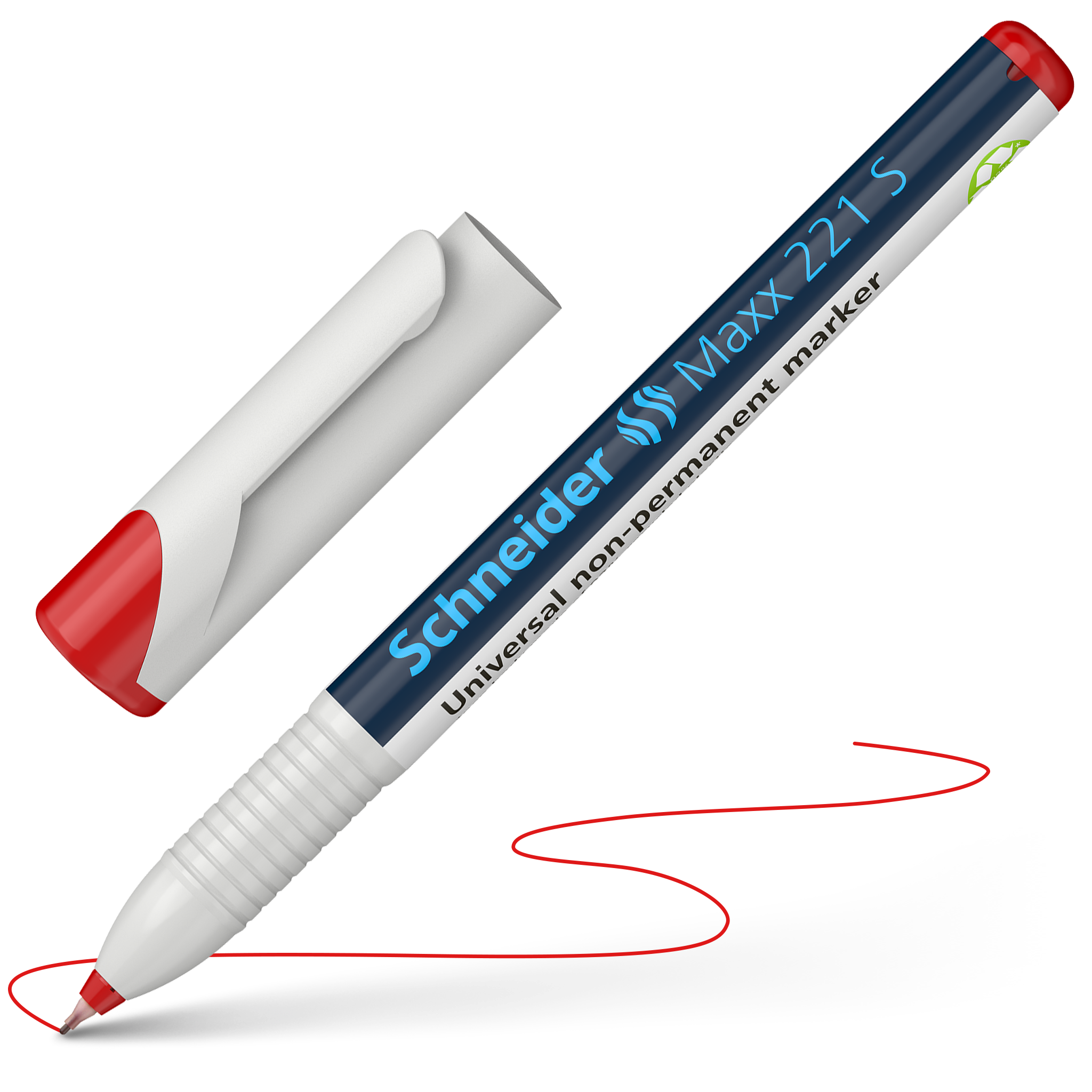 Marcador universal no permanente, tinta negra, ancho de trazo super fino (S) aprox. 0.4 mm. Tinta roja. Para casi todos los materiales, como, p. ej. láminas transparentes, papel, plástico, vidrio, etc. La tinta de colores vivos seca rápidamente, es resistene al agua y a la luz. Es de poco olor sin tolueno ni xileno. Modelo delgado de bolsillo y capuchón con clip práctico. El cuerpo* del bolígrafo es respetuoso con el medio ambiente y ahorra recursos, hecho con un 92% de plástico reciclado.
