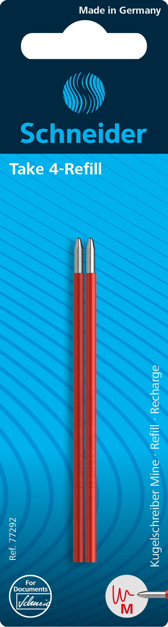 Recambio para el bolígrafo de cuatro colores \"Take 4\" en un paquete de 2 unidades (rojo). Ancho de trazo M. Con tecnología Viscoglide® para una escritura extraordinariamente suave y deslizante. Punta de acero inoxidable resistente al desgaste para una escritura permanentemente limpia. Resistente al agua según la norma ISO 12757-2.