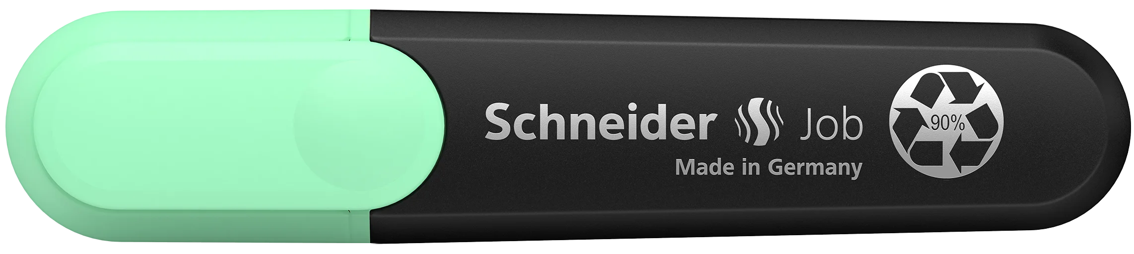 Resaltador con punta biselada 1+5 mm. Tinta menta. El resaltador Job es el primer resaltador fabricado con más del 90% de material reciclado que ha recibido el sello ecológico \"Blue Angel\", conocido en todo el mundo. El cuerpo, el depósito interno y la punta están hechos de plástico reciclado. La tinta es de origen biológico. Las tintas universales para papel normal, fotocopia y fax, tienen colores intensos y son muy resistentes a la luz. Esto hace que el resaltador Job sea ideal para su uso en la escuela, la universidad o la oficina y, con su punta biselada, también es perfecto para el trabajo creativo en agendas, o para la caligrafía. Con su gran reserva de tinta, el resaltador marca más de 15.000 palabras.