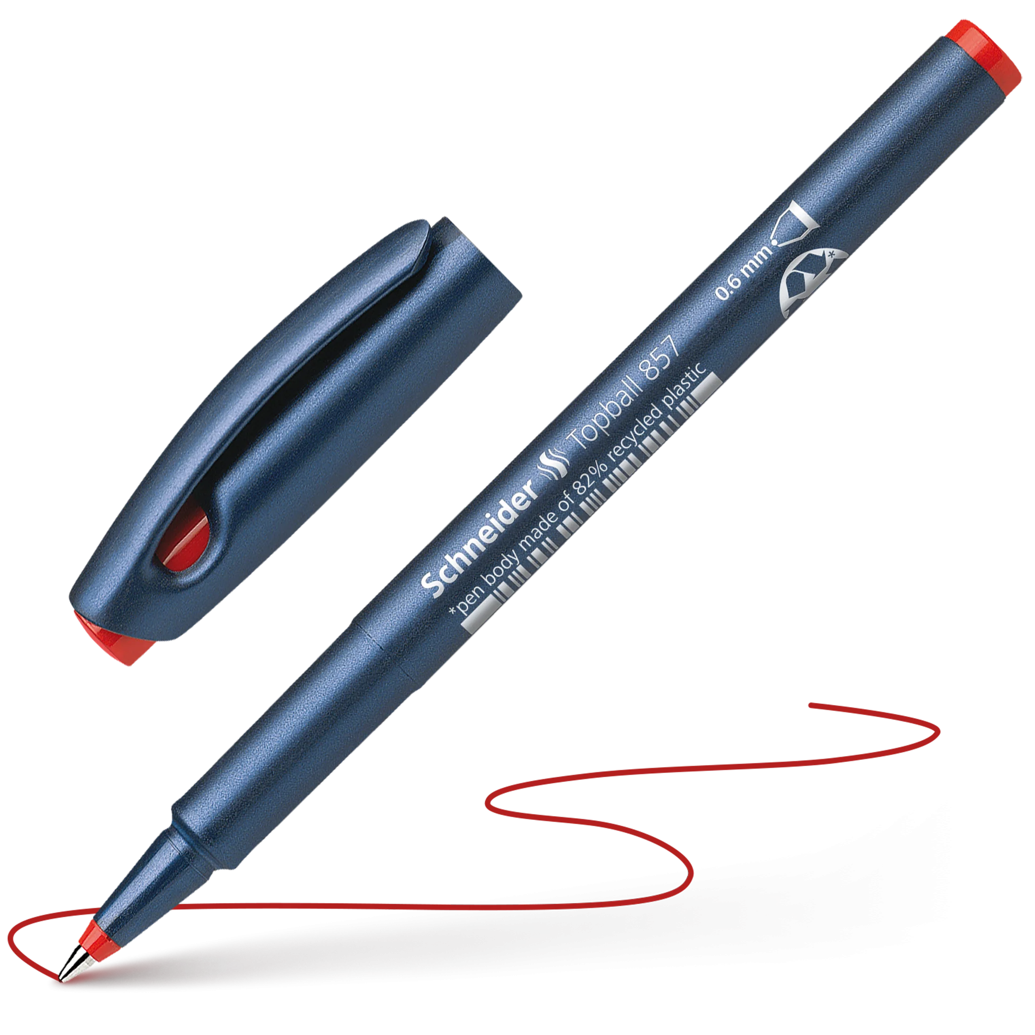 Rollerball con punta cónica de metal, ancho de trazo aprox. 0.6 mm. Tinta roja. Ideal para una escritura cómoda y sugerente. Respetuoso con el medio ambiente y ahorra recursos, hecho con 82% de plástico reciclado. La tinta “cap off” no se seca incluso si permanece destapado durante 2 ó 3 días.