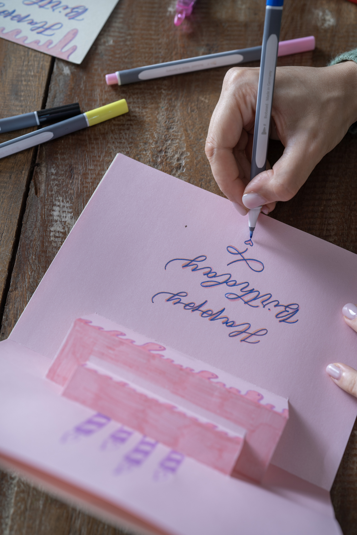 Les Brush Pens sont idéaux pour le handlettering, les cartes de vœux, la calligraphie, les sketchnotes, les bullet journals, la colorisation et bien d'autres choses encore. Ils inspirent l'expérimentation, la création, la reproduction et le coloriage. Des effets intéressants peuvent également être créés en les combinant avec d'autres instruments d'écriture. Le mélange de styles et de techniques donne de beaux résultats. Les couleurs se fondent alors les unes dans les autres, créant de superbes dégradés ou ombres. Ainsi, chaque personne créative parvient à mettre en œuvre ses propres idées et projets. Que l'on soit débutant*e ou avancé*e, travailler avec les stylos Schneider Brush de haute qualité "Made in Germany" est non seulement un vrai plaisir, mais permet également de ralentir le stress quotidien. Le calme, la patience, la concentration, la recherche de son propre style s'installent et le temps passe tout seul.