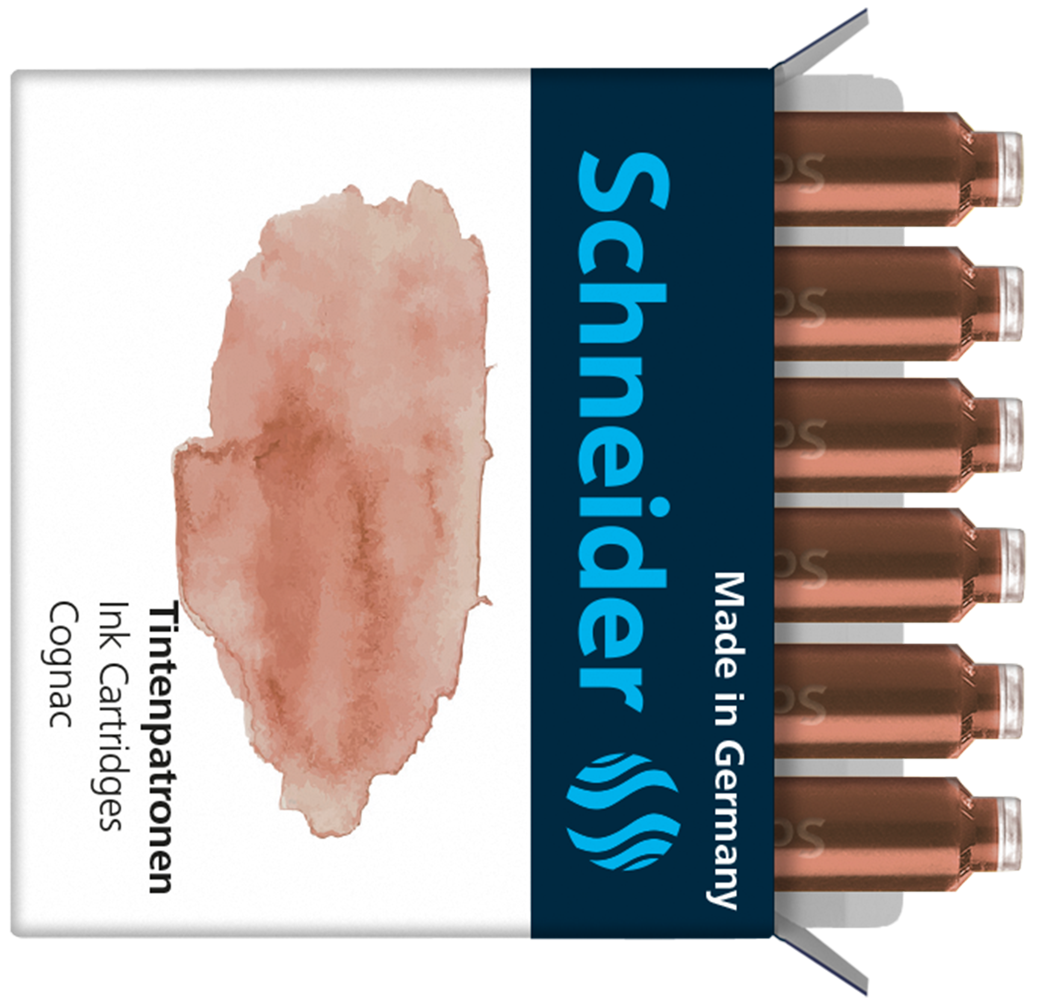 Cartouches d'encre pastel unique en couleur d'encre \"cognac\", avec lesquelles chaque style d'écriture prend tout son sens et il n'y a pas de limites à la créativité. Convient aux produits Schneider et à la plupart des stylos à plume et rollers à cartouche. Une boîte avec 6 cartouches d'encre. Qualité made in Germany.