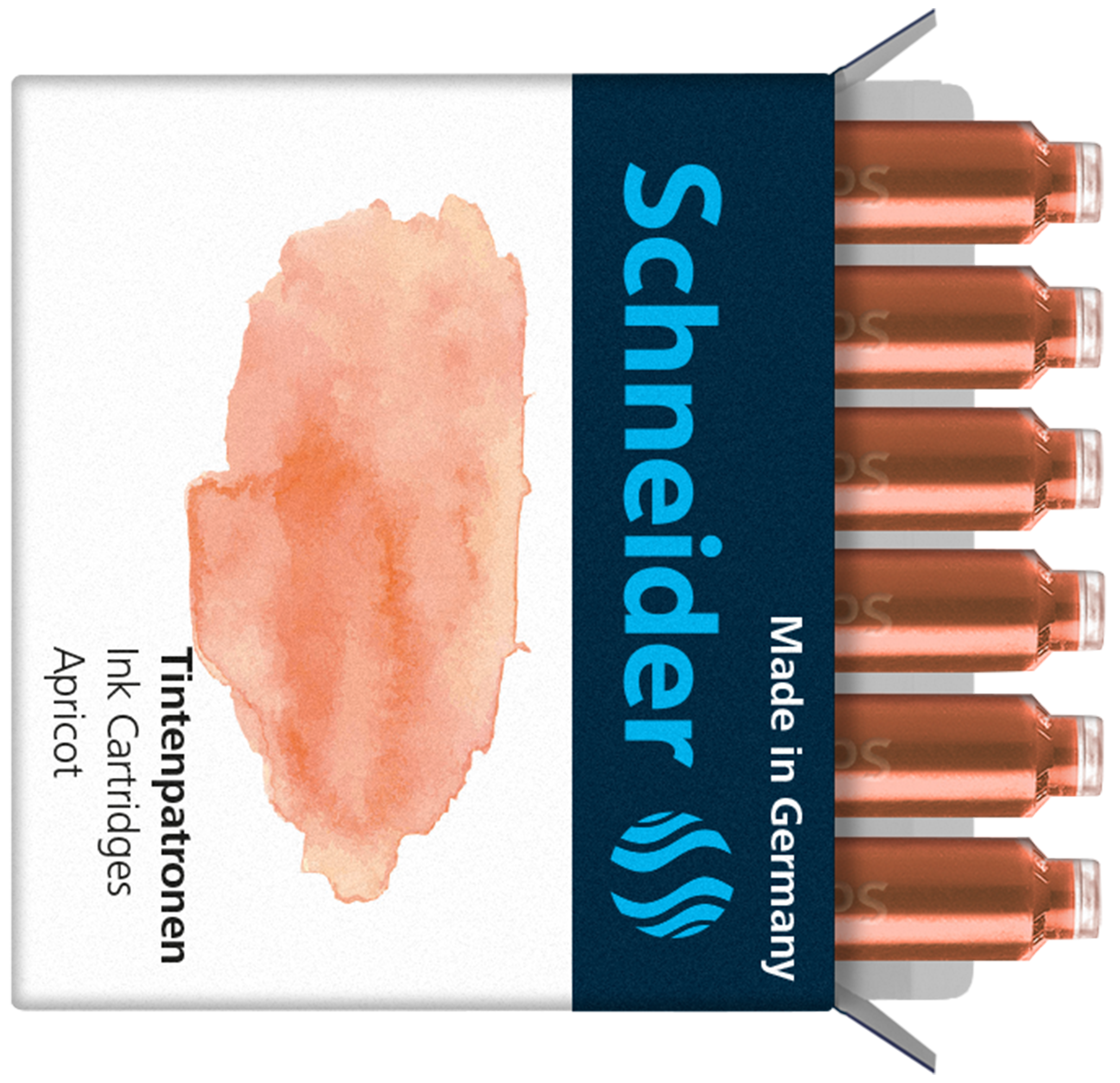 Cartouches d'encre pastel unique en couleur d'encre \"apricot\", avec lesquelles chaque style d'écriture prend tout son sens et il n'y a pas de limites à la créativité. Convient aux produits Schneider et à la plupart des stylos à plume et rollers à cartouche. Une boîte avec 6 cartouches d'encre. Qualité made in Germany.