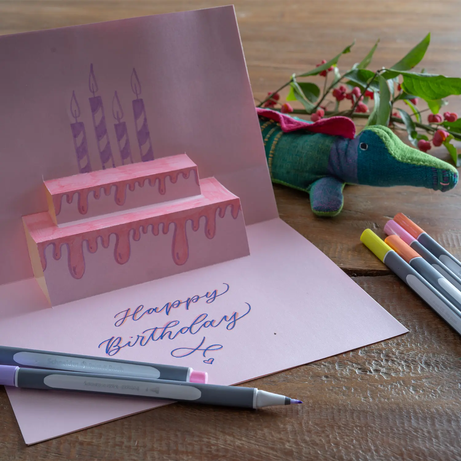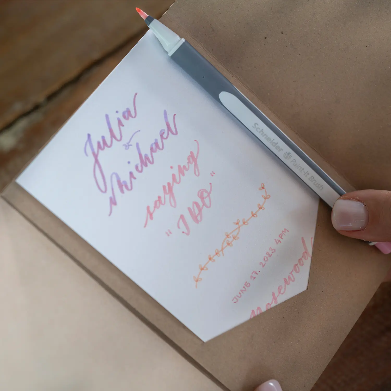 Brush pen avec pointe de pinceau flexible pour des applications créatives telles que le handlettering, la colorisation, les sketchnotes et bien d'autres. Corps fabriqué à 88% en bio-plastique. Récompensé par l'écolabel Ange Bleu\" le plus connu au monde pour sa production particulièrement économe en ressources naturelles et respectueuse de l'environnement. La pointe flexible du pinceau Premium permet de changer très facilement la largeur des lignes. Avec une pointe solide en plastique, le Paint-It brush pen est particulièrement durable, car il empêche la pointe de se plier de manière indésirable. Encre d'écriture: pink pastel. Il est donc idéal pour les polices en petits caractères et les motifs tels que les cartes de vœux et d'invitation, ainsi que les lettres et les messages de bienvenue. L’encre à faible odeur, à base d'eau, aux couleurs extrêmement intenses et lumineuses, est également idéale pour les effets d'aquarelle et de blending. L'encre sèche rapidement et convient donc parfaitement aux droitiers et aux gauchers. Brush pen avec pointe de pinceau flexible pour des applications créatives telles que le handlettering, la colorisation, les sketchnotes et bien d’autres.