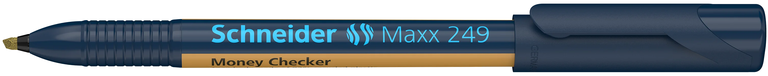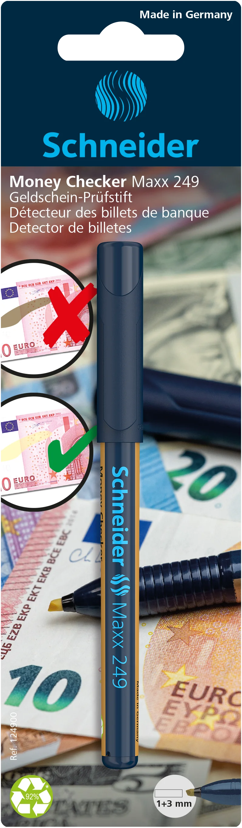 Stylo pour le contrôle rapide de l'authenticité des billets de banque. Détecte les faux billets de banque impriméa sur du papier normal contenant de l'amidon. Marquer : billet de banque authentique = trait clair ou jaunâtre, billet de banque falsifié = trait gris ou brun. La marque devient invisible sur le papier ne contenant pas d'amidon ; il reste en partie un trait clair. Pour plus de sécurité, utiliser en plus un appareil de contrôle des billets de banque.