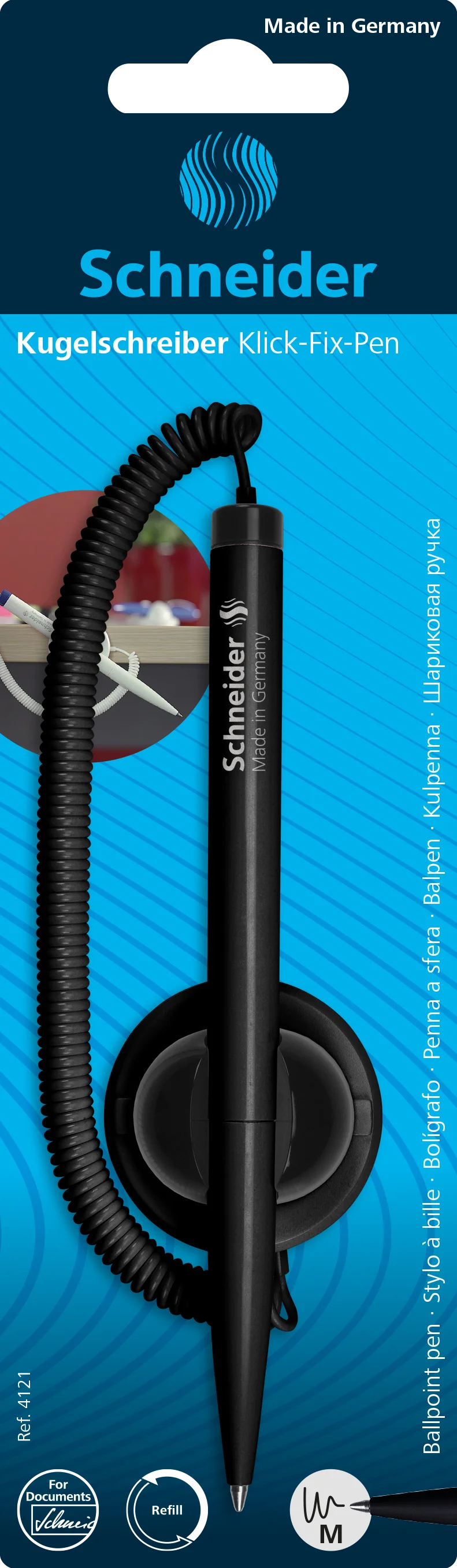 Stylo à bille avec chaînette à fixer à une caisse, un téléphone, dans un véhicule, etc. Le Klick-Fix est auto-adhésif et peut être tourné dans toutes les positions souhaitées. Couleur d'encre noire. Recharge interchangeable Express 775 M, indélébile selon la norme ISO 12757-2. La pointe en acier inoxydable résistante à l'usure garantit l'utilisation de tout le volume d'encre, écrit proprement et sans tache du début jusqu'à la fin.