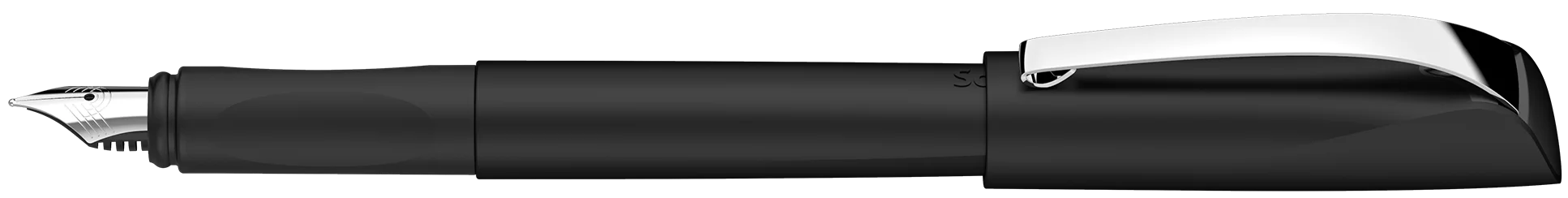 Fountain pen with ergonomically rubberised grip profile and high-quality stainless steel nib with iridium tip M. Modern design with elegant metallic look in colour spider black and striking curves. Equipped with a sturdy metal clip and standard ink cartridge, royal blue, erasable. Spare front part available. Equally suitable for right and left-handers.