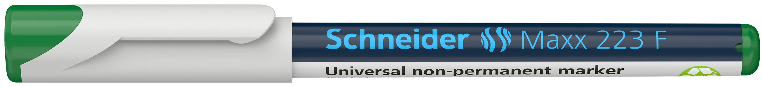 Marcatore universale non permanente, spessore del tratto Fine (F) circa 0,7 mm. Colore dell’inchiostro verde. Ideale per scrivere su lucidi (OHP), carta, plastica, vetro, metallo e sulla maggior parte delle altre superfici. Il tratto è di colore intenso e ad asciugatura rapida ed è tuttavia facilmente cancellabile con un panno umido. L’inchiostro è praticamente inodore e privo di toluolo e xilolo. Modello affusolato tascabile con pratico cappuccio con clip. Corpo penna ecologico e salva-risorse realizzato in plastica riciclata al 92%.